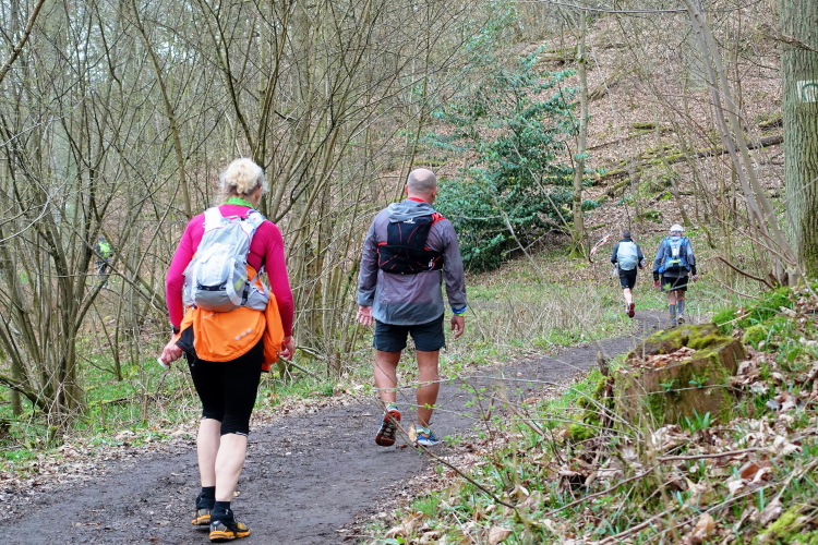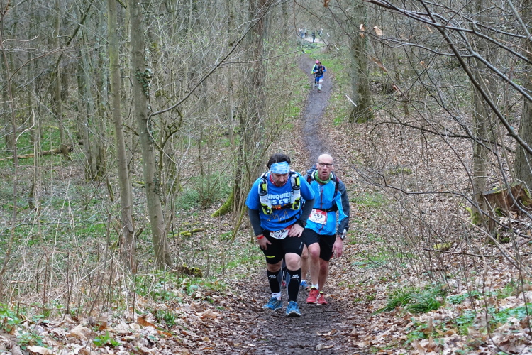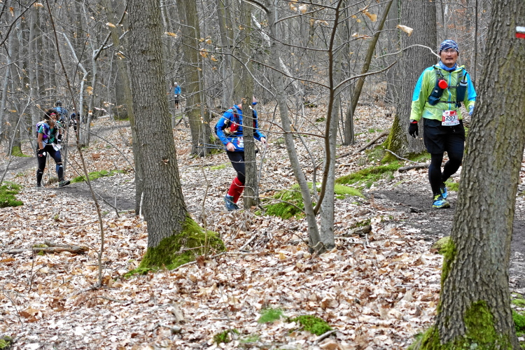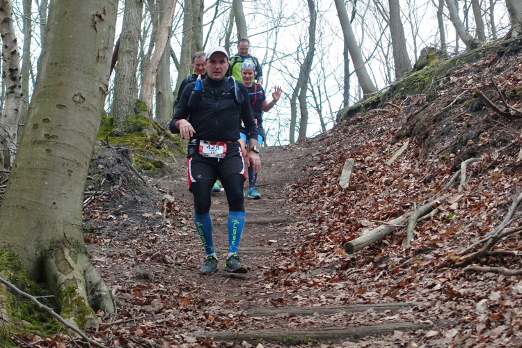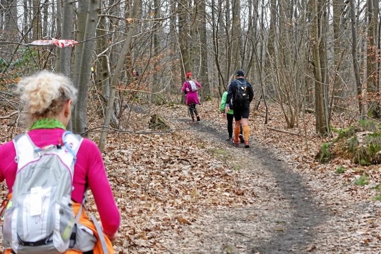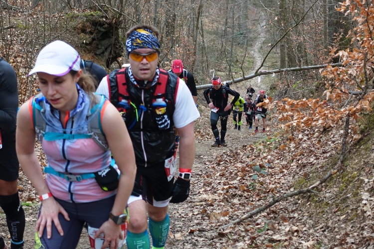 Dieser erste Abschnitt ist sozusagen der leichte Einstieg, die nächsten 23 Kilometer werden schwer, insgesamt 13 Anstiege sind zu bewältigen, insgesamt etwa 600 Höhenmeter. Wir sind gefühlt immer mitten im Feld, jede Menge Läuferinnen und Läufer vor, hinter und neben uns. Das gibt Sicherheit. Vor allem werden wir nicht „durchgereicht nach hinten“, sondern es sind eigentlich immer dieselben Läufer in Sichtweite, manchmal überholen wir den einen oder anderen. Das Wetter ist bestens, das Tempo stimmt, die Steigungen nehmen wir im Gehschritt mit Hilfe der Hände auf den Oberschenkeln, flache Abschnitte und Gefälle werden gelaufen. Der Untergrund ist recht moderat. Aber wie es so ist, unaufmerksam darf man nicht werden - zack, liege ich auf dem Boden. Zuvor bin ich schon x-mal über eine Wurzel oder einen Stein gestolpert, diesmal kann ich mich nicht abfangen. Zum Glück ist der Waldboden weich und ich habe keinerlei Blessuren zu beklagen.