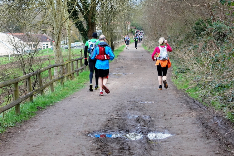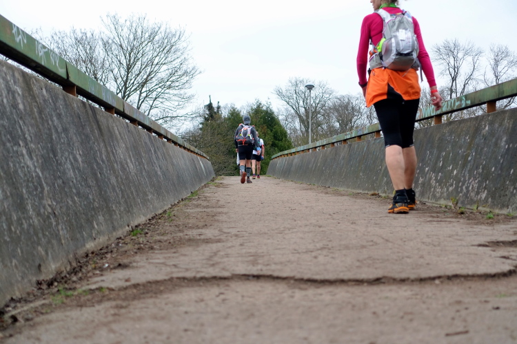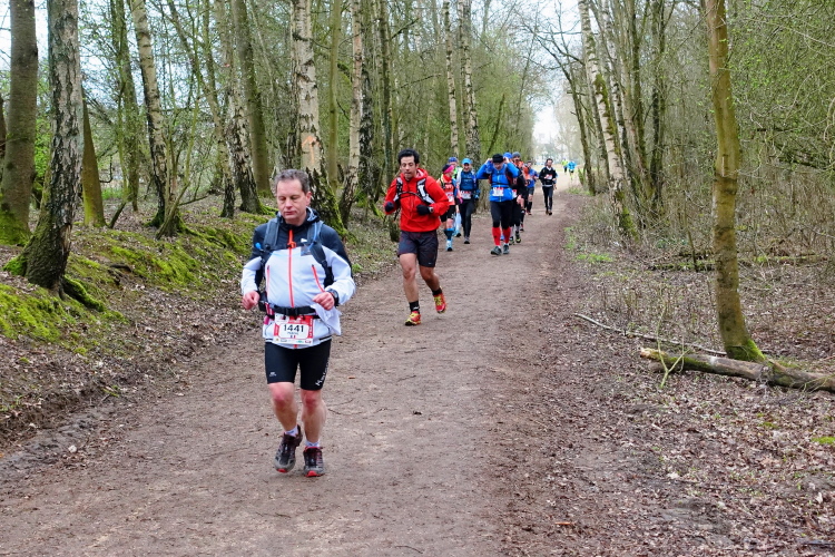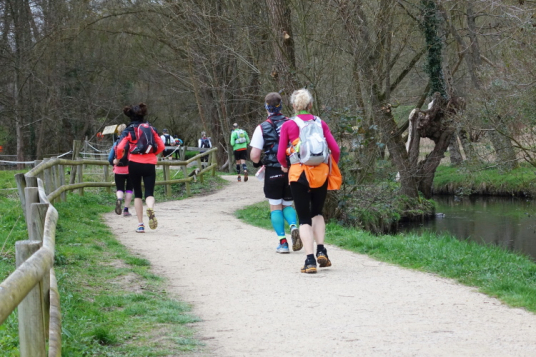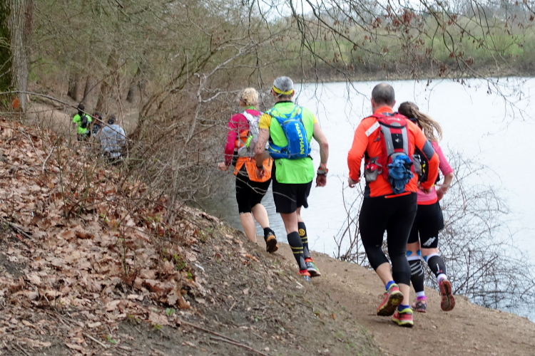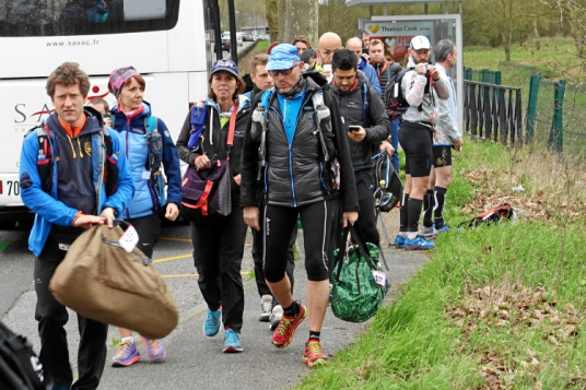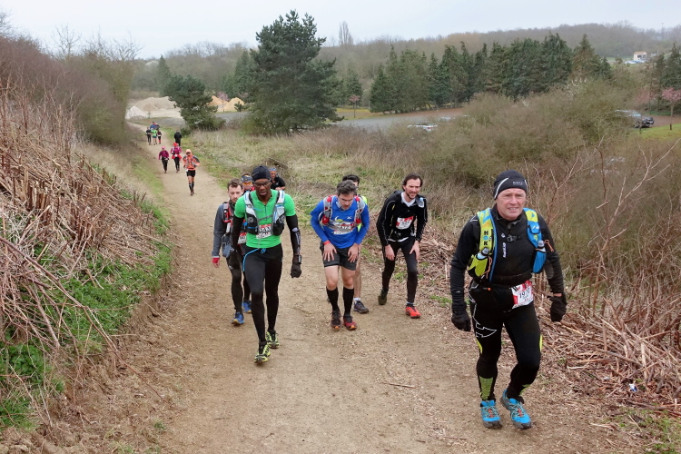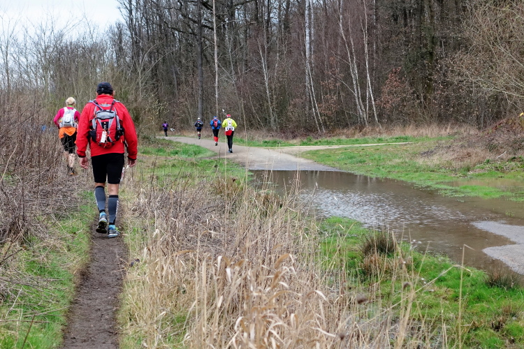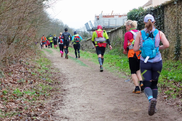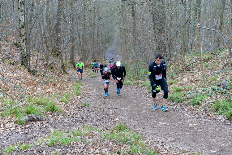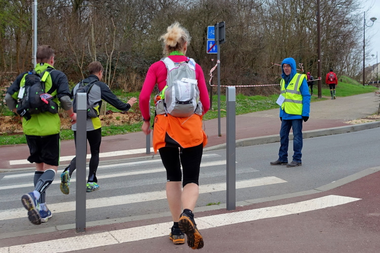 Mein Plan ist klar: Die erste Etappe bis zur Verpflegungsstation in Buc (km 23) will ich schnell laufen. Es ist auf den ersten 10 Kilometern recht eben, erst danach kommen vier An- und Abstiege, aber moderat, wie ich aus der Erinnerung heraus wusste. Auf diesem Streckenabschnitt kann man ein Zeitpuffer herauslaufen. Das Zeitlimit bis hierhin sind 3h30. Geplant habe ich 3 Stunden, geschafft habe ich dann 2h50 und das trotz des 4-Minuten-Staus vor der Brücke in Saint-Quentin-en-Yvelines! Prima, ich bin zufrieden. Flaschen auffüllen, etwas trinken, noch eine Hand voll Nüsse und Rosinen essen, ein paar Schokoladerippchen und sieben Minuten später sind wir wieder unterwegs.