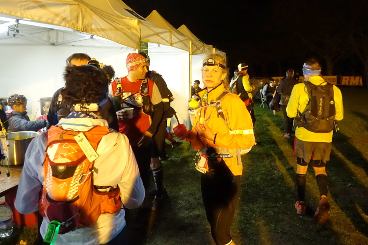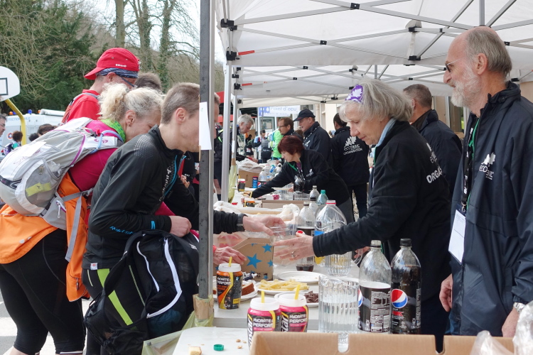 Im Vergleich zur Verpflegungsstelle bei Kilometer 23 in Buc, ist diese noch reichhaltiger bestückt. Neben Rosinen, Erdnüssen, Käse, Salami, Kräcker, Kuchen, Cola, Wasser gibt es auch Nudelsuppe mit Brot. Entsprechend lang ist unsere Pause, bevor es weiter geht.