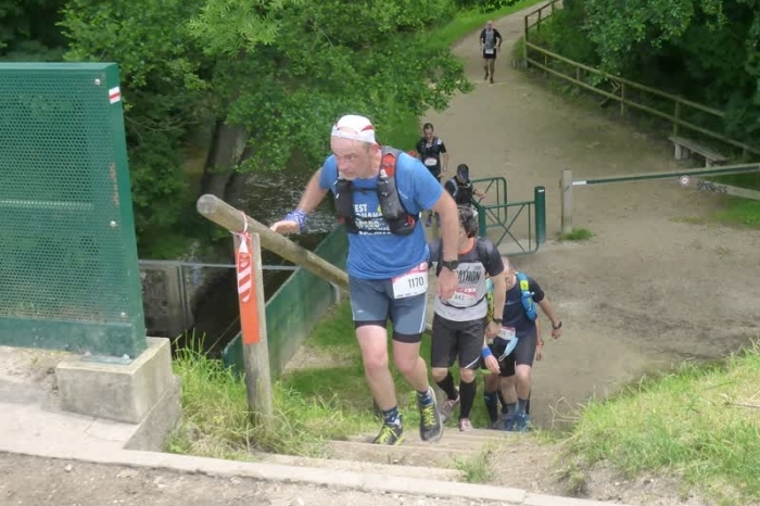 Heute geht es ganz gut. Ich kann alle Gefällstrecken laufen, obwohl mich manche steinige Abhänge an die Grenze bringen. Bald erreiche ich Meudon. An jedem Abzweig stehen nun Streckenposten und weisen uns den Weg. Es geht an der Chapelle Saint-Philippe vorbei scharf links in den Park, dort wieder links eine steile Treppe hinauf, oben rechts und wieder links. Auf der nächste Treppe bemitleide ich einen Kollegen, der sich auf einen im Wald gefundenen Stock abstützt, um die Stufen zu erklimmen. Das sieht nicht gut aus. Oben vor dem Orphelinat Saint- Philippe befindet sich die Zeitmessung und das ersehnte Wasser.
