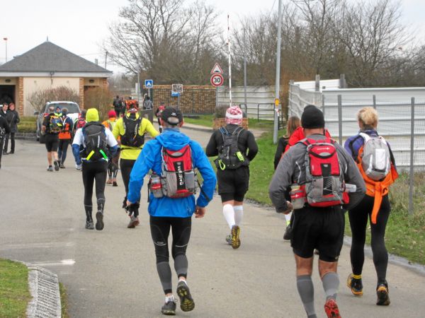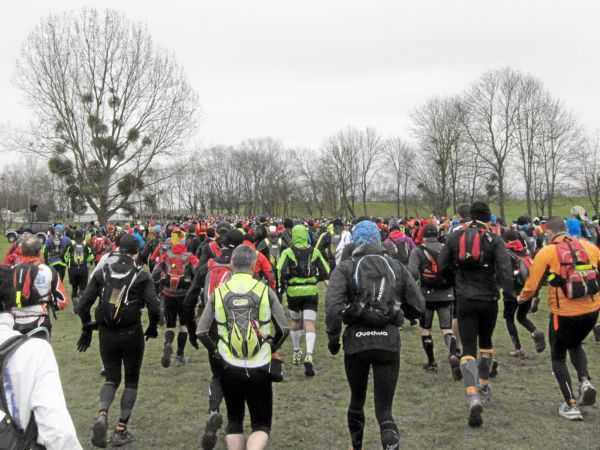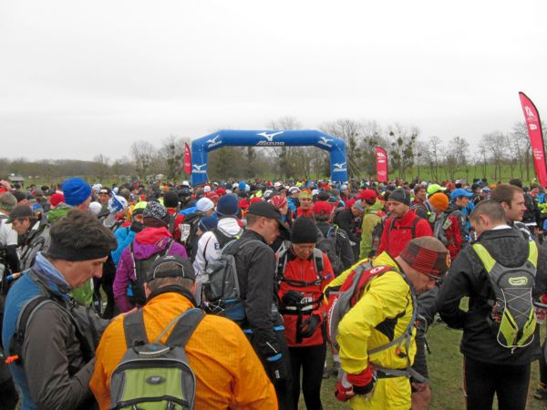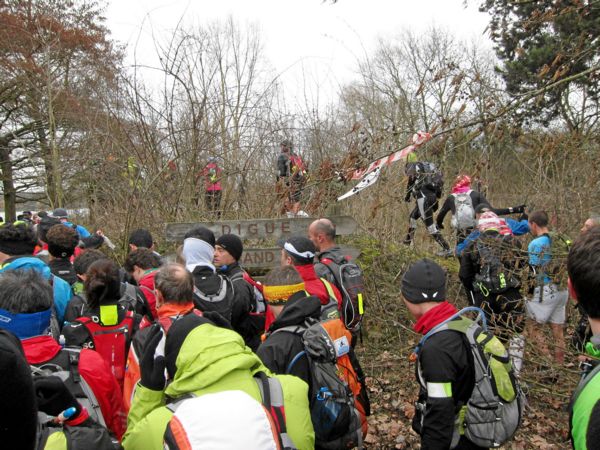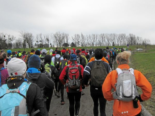 Kaum waren wir unterwegs, schon wurden wir wieder ausgebremst – alle mussten durch den schmalen Durchgang und über die Zeitmessmatte. Bereits hier, wenige Minuten nach dem Start, sah ich die ersten, die den Lauf beendeten, bevor er richtig begonnen hatte. Insgesamt fünf wollten dem Wetter und den 78 Kilometern bereits hier nicht mehr trotzen!