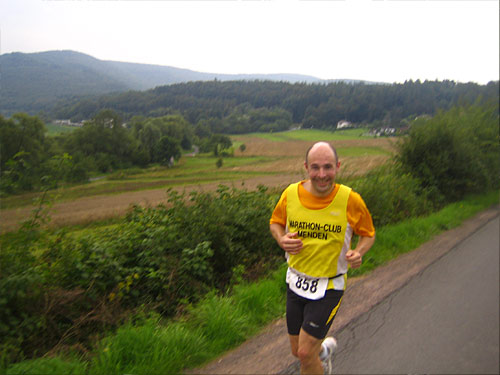 171 Einzelstarter und 48 Staffeln gehen an den Start. Die Männer-, Frauen- und Mixedstaffeln beleben den Lauf ungemein. Gerade für Ultras konnte es sonst schon ein recht einsamer Lauf werden. Aber überhaupt nicht langweilig. Denn die Strecke ist sehr abwechslungsreich, und immer wieder präsentieren sich dem Läuferauge Highlights. Aber vielleicht sollte ich kurz mit dem beginnen, was nicht unbedingt als Hightlight bezeichnet werden kann: Die Zuschauerbeteiligung. Wer auf der Strecke hin und wieder tosenden Beifall braucht, ist hier fehl am Platze. Die gefühlte Zuschauerzahl beträgt etwa 51. Und zwei Dritteln von denen ist es total egal, dass da einige mit einer Startnummer um den Hals herumlaufen. Aber dann gibt es doch wieder Ausnahmen: Zwei Mädel rufen mir auf dem vorletzten Teilstück mit nordhessischer Deutlichkeit entgegen: „Lauf zuuu! Der nächste ist nur 200 Meter entfernt!“ Ja, danke, es gelingt mir auch, ihn zu überholen, aber dummerweise ist es ein Marathoni und kein Ultra. Gut gemeint, aber keinen Platz gut gemacht.