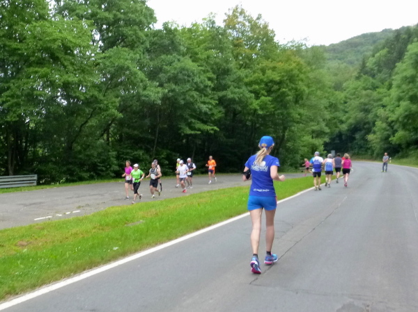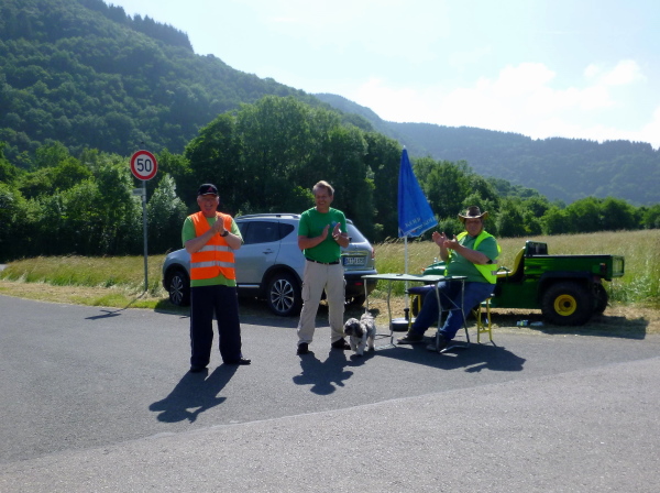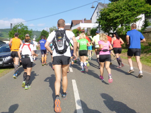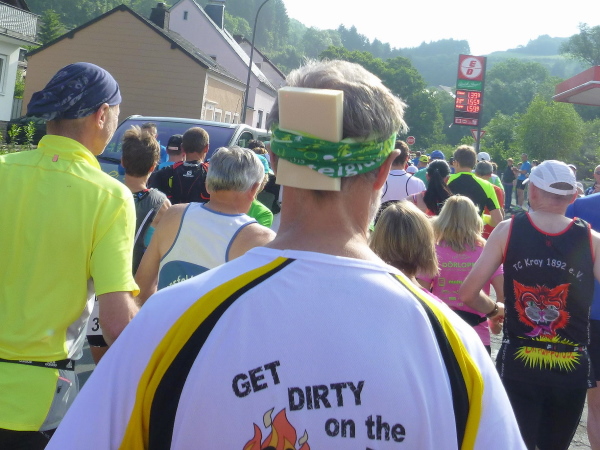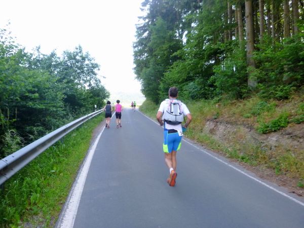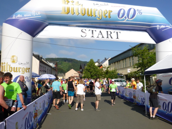 Nach einer halben Stunde laufe ich unter dem Jubel der Zuschauer durchs Ziel – und hinten wieder hinaus. Es sind ja erst 6 Kilometer gelaufen. Die Polizei regelt den Verkehr während wir kurz an einer stark befahrenen Straße entlang müssen. Dann geht es links Richtung Krautscheid. Hier scheint für den Verkehr gesperrt zu sein, so dass wir mitten auf der Straße laufen können. Dafür geht es wieder bergauf. Als wir den Schatten der großen Bäume verlassen, dürfen wir den Ausblick auf die liebliche hügelige Landschaft genießen. Hinter Niederpierscheid führt die Strecke auf einem Feldweg endlich bergab. Wir überqueren ein Bächlein, es geht am Waldrand entlang und dann wieder auf die Straße. Eine Brücke führt über die Prüm und es geht erneut bergauf. An der langen Serpentine stehen Helfer, die aufpassen, dass man nicht versehentlich die falsche Abzweigung nimmt. Sie feuern uns an und ich bitte sie doch hier auf mich zu warten. Sie sind zuversichtlich, dass ich ja sicher in zwei Stunden wieder hier sein würde. Das ist zweifellos spaßig gemeint. 6 Stunden später sind sie tatsächlich noch hier und klatschen immer noch.