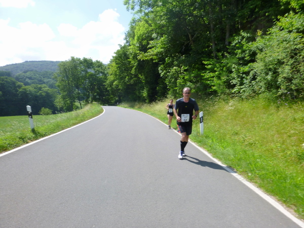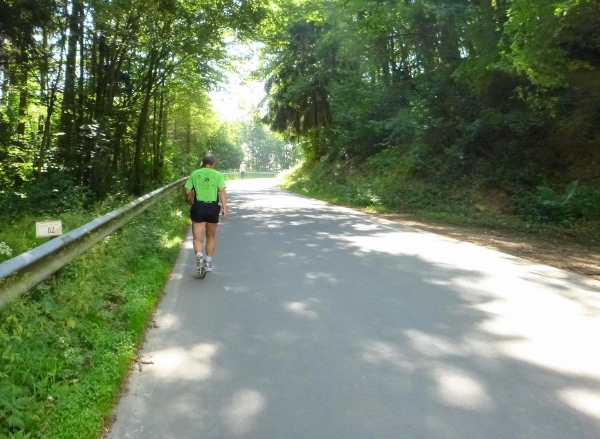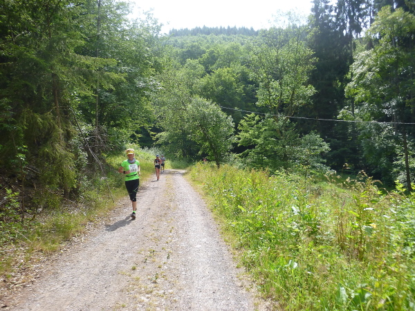 In Mauel gibt es zusätzlich zum Wasser, Pfefferminztee. Das ist genau das richtige. Für Cola, Äpfel und Rosinen ist es noch zu früh für mich. Die Straße wechselt auf einen Feldweg und wir kommen in den Wald (km 13). Liane, die bisher mit mir im selben Tempo unterwegs war, ist bergauf doch deutlich schneller. Ihr leuchtendes pinkfarbenes Shirt dient mir vorne als Wegweiser. Plötzlich ist sie verschwunden. Hinter mir ist auch niemand. Bin ich falsch gelaufen? Gott sei dank, da ist ein Kilometerschild. Es geht leicht bergab. Die Bäume öffnen sich und ich genieße für einen Moment einen tollen Ausblick über ein grünes Blätterdach unter mir. Jetzt wird es bergab richtig steil. Während ich noch am Bremsen bin, kommt mir ein Mountainbiker entgegen. Er rennt und schiebt sein Bike bergauf. Auf meine Frage erklärt er, dass der Führende des Halbmarathons hinter ihm kommt. Ich bleibe schnell stehen und lasse den schnellen Läufer vorbei. Auf mein motivierendes „auf, auf“ antwortet er locker: ja, aufwärts geht es hier wirklich“. Wer noch soviel Luft und Humor hat, wird das Rennen problemlos gewinnen können. Tatsächlich kommen die Nächsten erst nach einer ganzen Weile.
