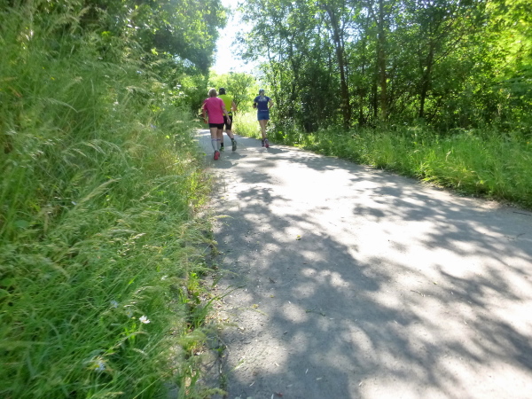 Norbert läuft zunächst wieder mit mir. Ich merke schnell, dass mir die Oberschenkel brennen, aber jetzt schon gehen, ist mir doch zu peinlich. Hinter dem Ortsschild wird es flacher und ich kann mein Tempo einstellen. Auch Norbert sucht jetzt sein Tempo und läuft nach vorne. Nun kommen uns Läufer entgegen. Zuerst vereinzelt dann immer mehr. Beim Wendepunkt erkenne ich, dass sich hinter mir nur noch wenige Läufer befinden.