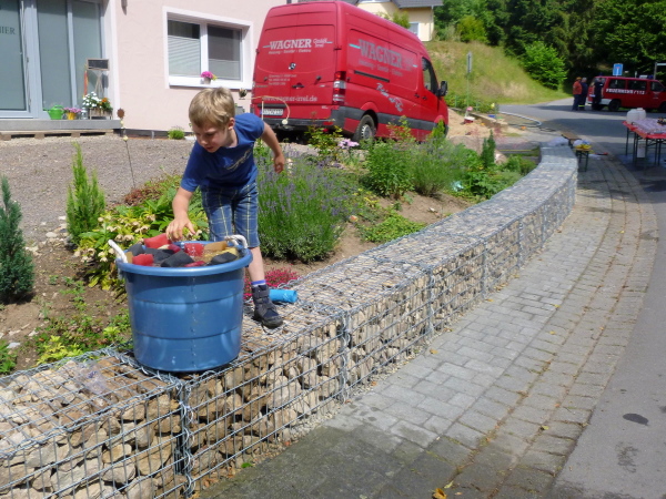 Am nächsten Morgen lädt der Musikverein zum Frühstück ins Bürgerhaus. Wir holen zunächst unsere Startunterlagen und sind erstaunt über die gut gefüllte Startertasche. Hier haben sich die Sponsoren nicht lumpen lassen. Nach dem Frühstück mit frischen Brötchen genießen wir die Zeit zum entspannen. Mittlerweile ist ganz schön was los. Über 400 Starter werden erwartet. Das Wetter verspricht angenehm zu werden: sonnig, aber nicht heiß. Um Viertel vor neun wird es draußen auf der Straße lebendig. Der riesige Startbogen war uns schon vorher aufgefallen. Durch die laute Musik und die vielen Menschen herrscht eine betriebsame Vorstart-Atmosphäre. Einige Läufer haben sich bereits vor dem Startbogen aufgestellt. Der Sprecher klärt auf, dass sie auf der falschen Seite stehen. Verwirrt wechseln sie die Position. Es geht andersherum, als wir denken.