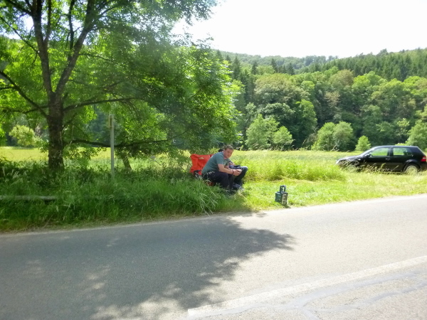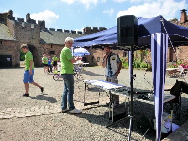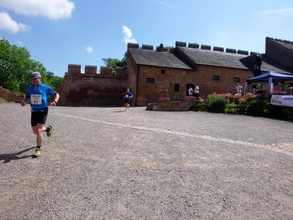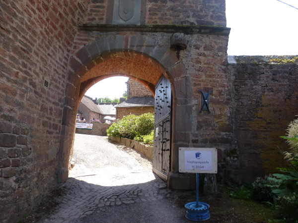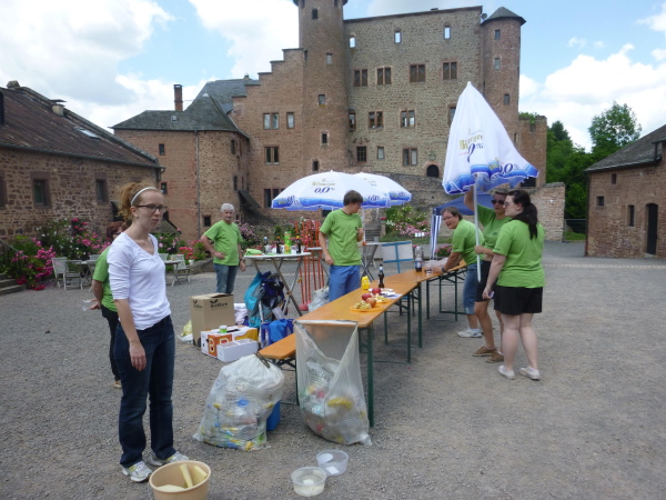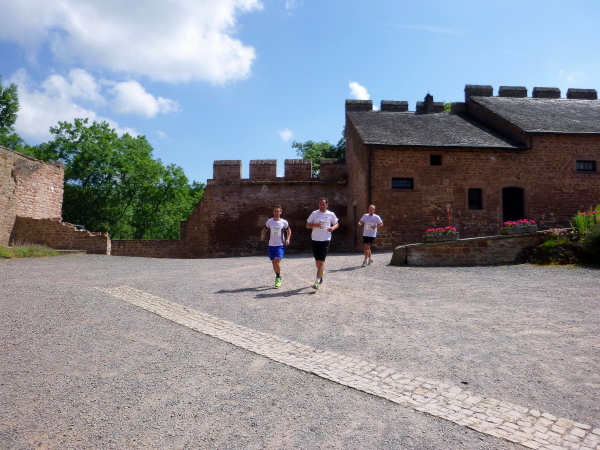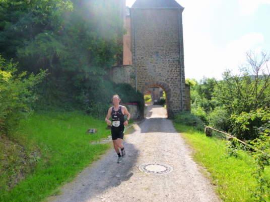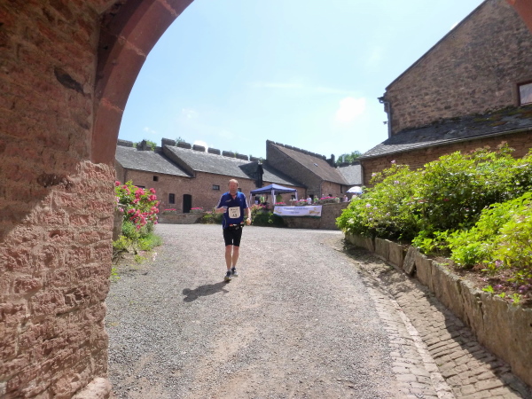 Das ständige Entgegenkommen motiviert mich zügig zu laufen. Die Strafe folgt auf den Fuß. Meine Beine werden schwer. Jetzt halte ich erst einmal an der nächsten VP an. Dort gibt es Bitburger alkoholfrei. Das ist ein Wort. Noch einen Apfelschnitz für unterwegs und gestärkt, sowie etwas langsamer, setze ich meinen Weg fort. Nach einem längeren Stück auf der Straße liegt hinter einer Kurve Schloss Hamm. Schon von Weitem höre ich die Klänge von Dudelsäcken. Im Schlosshof, wo der Halbmarathonstart war, ist es jetzt ruhig. Ein Moderator sagt mich an und an der VP kann ich mir aussuchen, was ich haben möchte. Es gibt auch nochmals Schwämme. Man hätte sie bereits bei der Startnummernausgabe erhalten können, aber ich dachte nicht, dass man sie brauchen würde. Die Sonne brennt mittlerweile aber doch ganz schön. Auf den schattigen Wegen hatte man das gar nicht so gespürt. Ich verzichte trotzdem darauf einen Schwamm mitzunehmen und erfrische mich hier nur kurz.