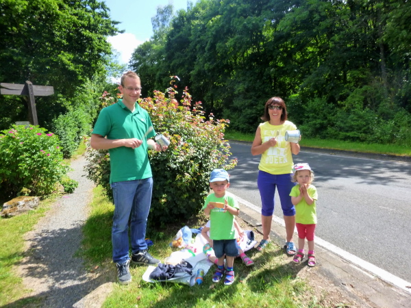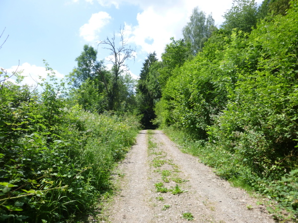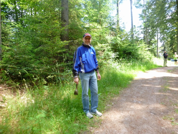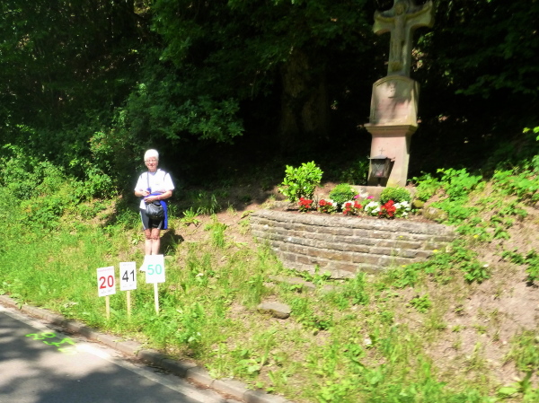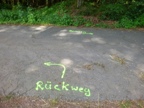 Der Moderator fragt mich in der Zwischenzeit ob Norbert auch noch kommt. Der weiß wohl nicht wie schnell mein Mann unterwegs ist. Ich klär ihn auf und entschwinde über den Parkplatz. Gerade kommt ein Läufer entgegen. Er warnt mich, dass es jetzt richtig steil werden würde. Da bin ich mal gespannt. Zuerst geht es bergab, dann geradeaus. Mir schwant nichts Gutes: vor mir liegt ein Berg. Der Weg geht beinahe senkrecht nach oben. Die Entgegenkommenden können kaum bremsen. Schritt für Schritt steige ich auf der Straße nach oben. Als der Asphalt endet muss ich mich kurz orientieren. Es gibt 2 Pfeile: an dem einen steht „Hinweg“ an dem anderen „Rückweg“. Jetzt ist klar: ich muss noch weiter nach oben (km 25).