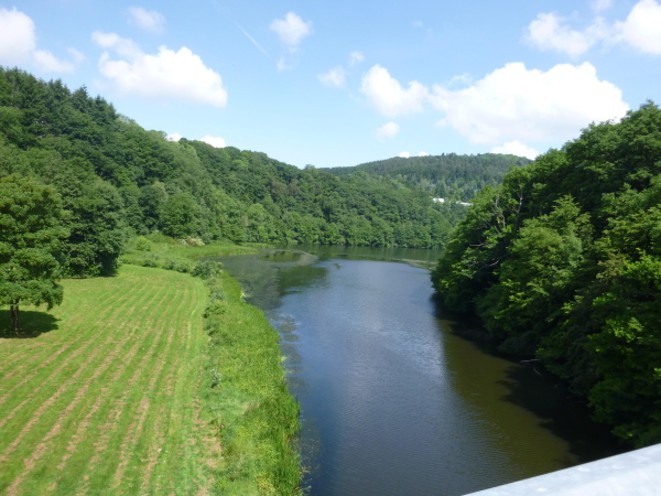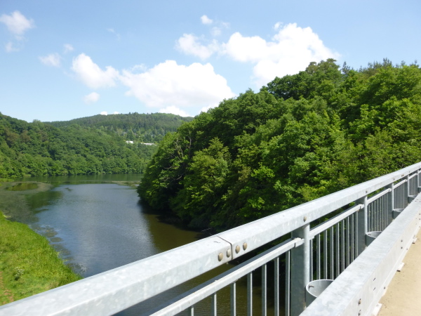 Ich verlasse den Schlosshof durch das hinteren Tor und laufe bergab. Es geht über die Straße und auf einen schmalen Trail. Jetzt kommen mir viele Marathonläufer entgegen und auch das Fahrrad der führenden Marathonfrau. Das ist ganz schön eng und ich versuche, den Entgegenkommenden so gut wie möglich auszuweichen. Auf der Straße wird es dann besser; hier hat jeder seine eigene Seite. Dann liegt der Biersdorfer Stausee vor mir. Es geht auf einen winzigen Trail. Eine Familie mit diversen Krachmacher -Instrumenten feuert mich an. Der Trail ist nur kurz und ich erreiche eine lange Brücke. Auf der anderen Seite stehen Feuerwehrmänner bei ihrem Auto. Ich bin unsicher. Wo trennt sich die Ultrastrecke vom Marathon? Auf jedem Schild steht nur Marathon, deshalb frage ich lieber mal nach. Nein, ich bin hier richtig.