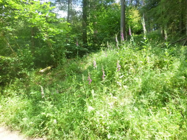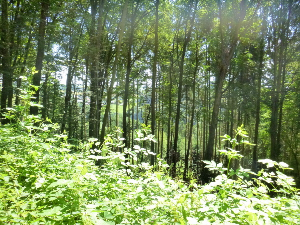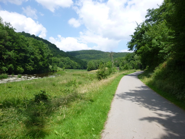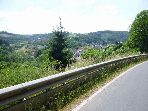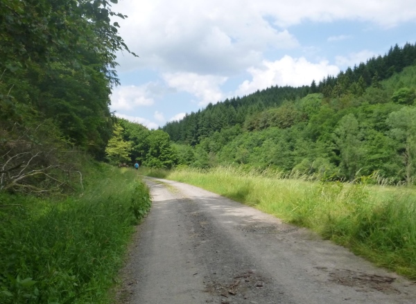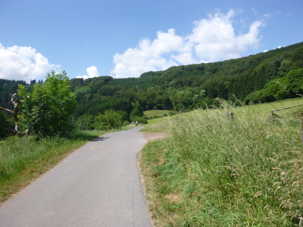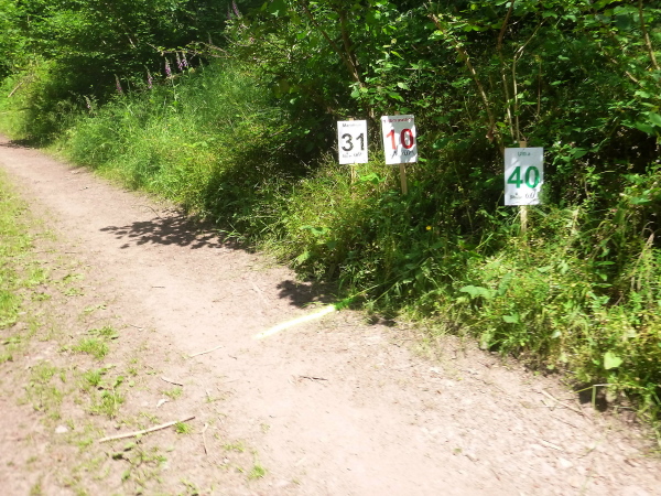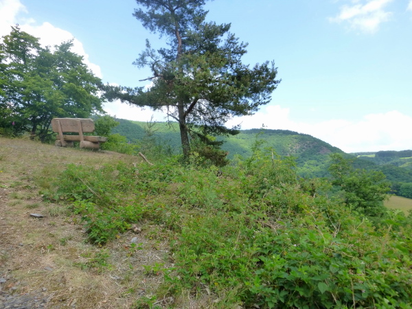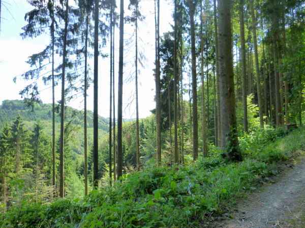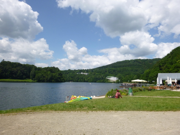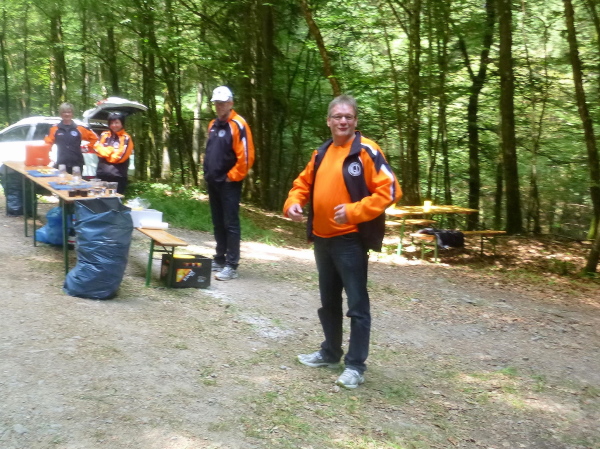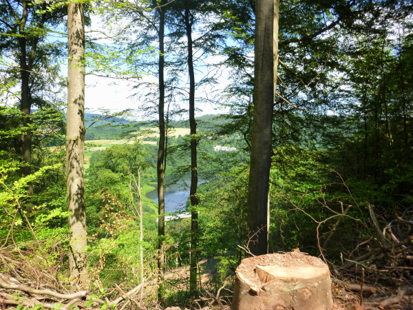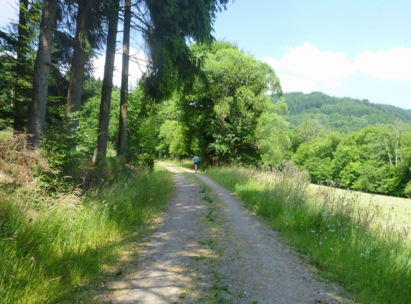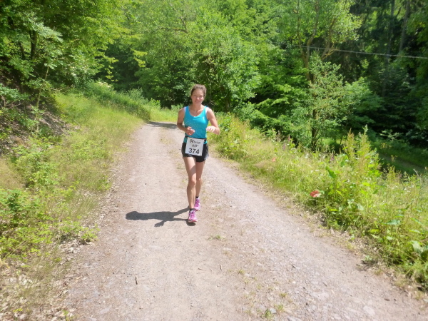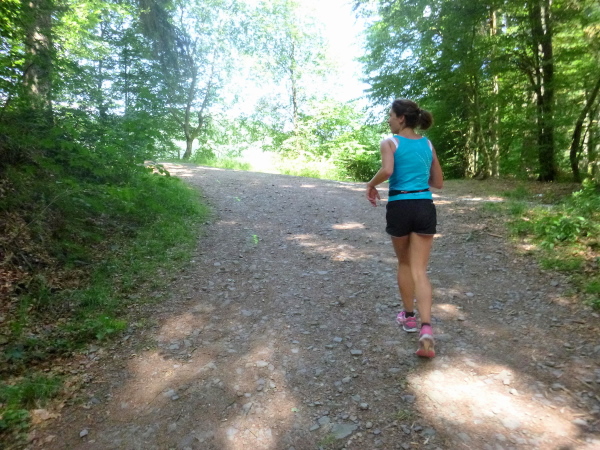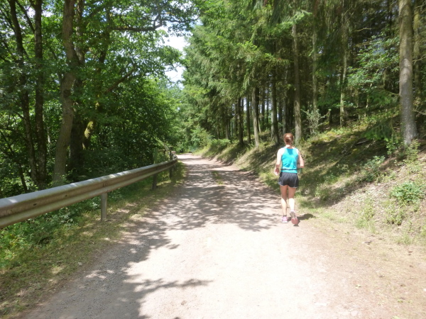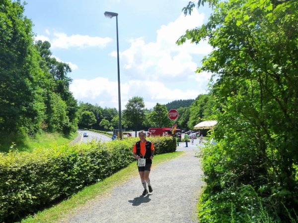 Hier ist es richtig schön. Immer wieder öffnet sich der kühle Wald und gibt fantastische Ausblicke frei. Ich bin ganz alleine und genieße die Ruhe. Der Weg ist eindeutig mit gelben Pfeilen markiert. Trotzdem bleibe ich konzentriert. Ich bin froh, dass ich unten noch etwas getrunken habe. Da es nun immer wieder bergauf geht brauche ich viel mehr Zeit, als gedacht. Ich glaube, die Strecke führt mehrfach im Kreis und die Richtung ändert sich ständig. Manchmal sehe ich den Stausee unter mir und kann sogar den Sprecher hören. Dann hinter km 29 erreiche ich die VP. Es gibt richtiges Bitburger. Die Helfer sind locker drauf und laden mich ein, doch hier zu bleiben. Ich nehme kurz auf der Bierbank Platz, doch dann muss ich weiter.