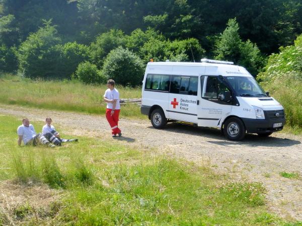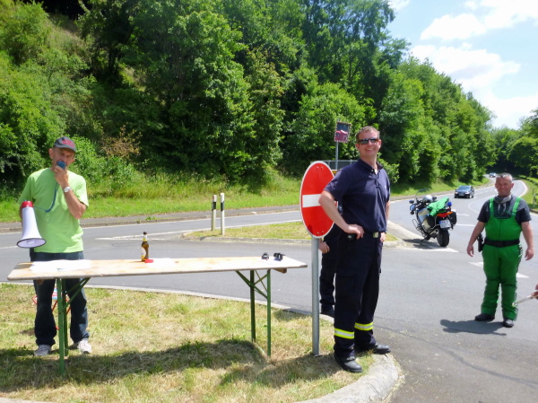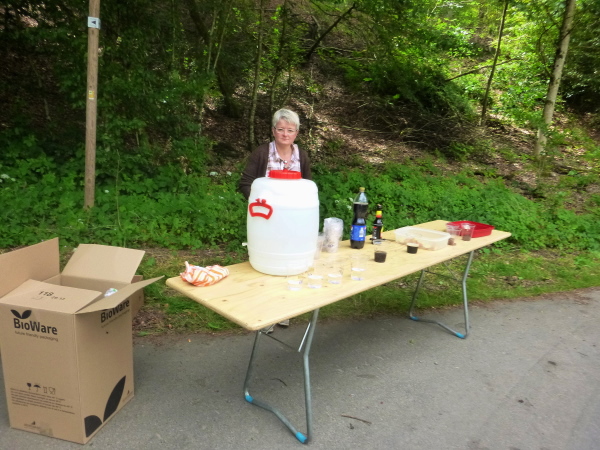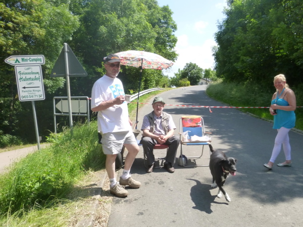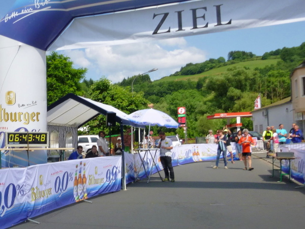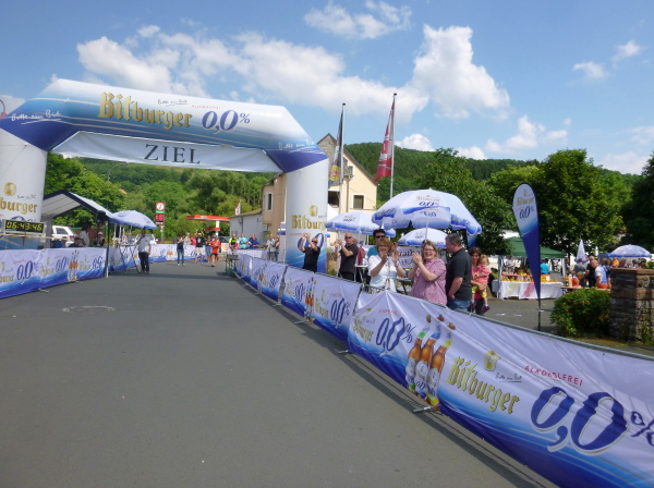 Bei km 50 steht eine Zuschauerin und beglückwünscht uns schon mal. Es geht, mit Pylonen von der Straße abgetrennt, bergab. Ein Helfer lotst uns über die Straße. Dann kommt die letzte Kurve und wir gehen gemeinsam durchs Ziel. Norbert und Bernd erwarten mich bereits. Es gibt eine Medaille. Auf Norberts Bitten hin haben die freundlichen Helfer von Bitburger zwei Flaschen für mich zur Seite gestellt. Das war jedoch nicht notwendig: es gibt noch genügend. Dazu noch jede Menge Bananen und Äpfel.