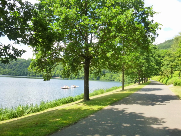 Also gut, es geht links wieder in den Wald. Oberhalb des Stausees führt die Strecke auf einem lauschigen Waldweg entlang. Viele Spaziergänger sind hier unterwegs. Ich laufe konzentriert von einem leuchtend gelben Pfeil zum nächsten. Eigentlich ist alles super markiert, aber wenn ich vor und hinter mir keinen Läufer sehe, bin ich doch immer verunsichert. Nur, wenn dann wieder ein Kilometerschild steht, bin ich beruhigt.