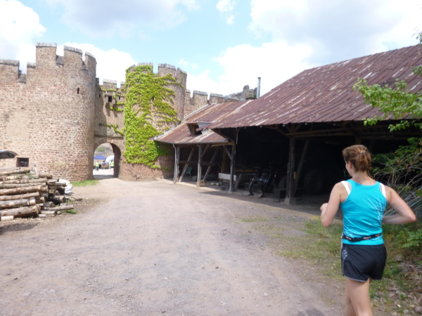 Dann erreiche ich die vom Hinweg bekannte Strecke. Ich bin gerade auf dem winzigen Trail bergauf, da höre ich plötzlich Schritte hinter mir. Eine junge Frau in türkisenem Shirt kommt von hinten. Ich frage, wo sie so lange war. Sie meint, dass sie immer in gleichem Tempo unterwegs ist. Ich schließe daraus, dass ich wohl langsamer geworden bin. Zusammen laufen wir im Schloss Hamm ein. Hier ist es ganz schön windig. Die Helfer kämpfen mit den Schirmen. Ich verweile etwas. Als ich das Schloss verlasse, ist das türkisene Laufshirt schon außer Sichtweite.