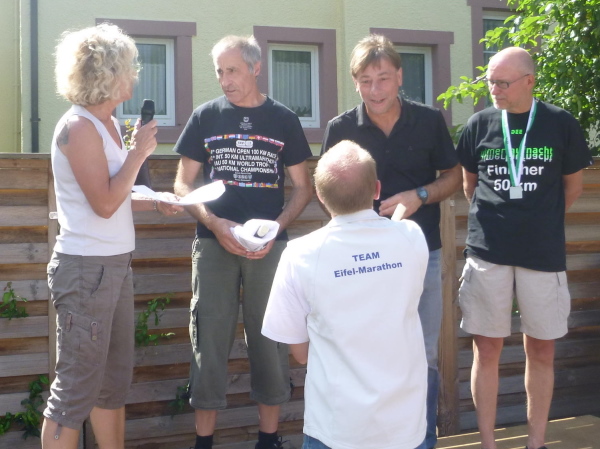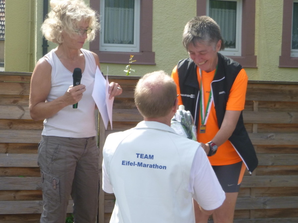 Vor dem Bürgerhaus ist die Siegerehrung für den Marathon in Gange. Die Ehrung für die Ultras gibt es eine Halbe Stunde später. Der Belgier Luc Dirckx konnte in der fantastischen Zeit von 3:39:14 Std den Ultra-Lauf gewinnen. 2 Minuten später schaffte es Gerd Mertens als zweiter und mit 4:29:47 wurde Robert Gotto dritter. Dirckxs Landsfrau Hilde Geerts hatte bei den Frauen die Nase vorn: 5:05:29 Std reichten zum knappen Sieg vor der erst 25 jährigen Rebecca Lenger, die nur 29 Sekunden später im Ziel war. Natalia Uzunbajakava war mit 5:14:31 nur unwesentlich langsamer.