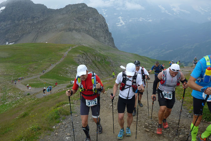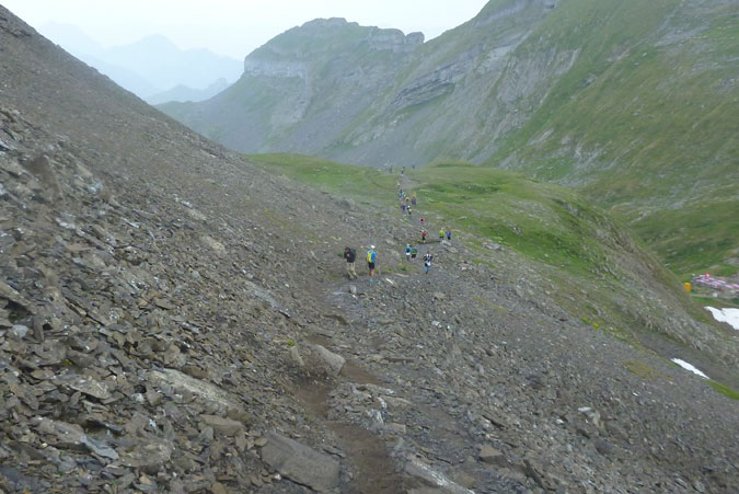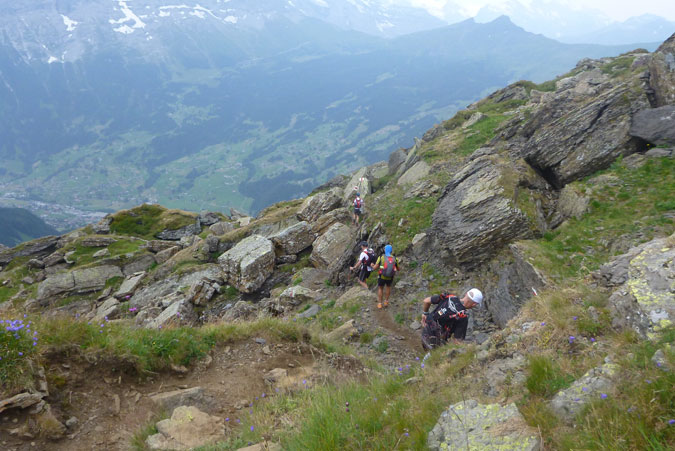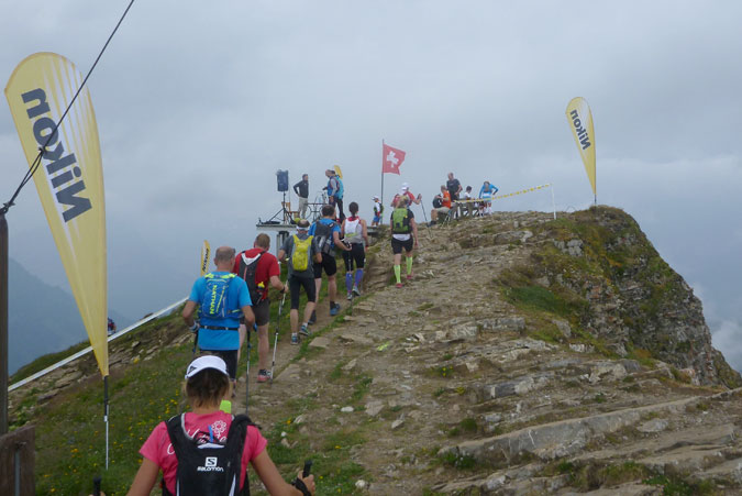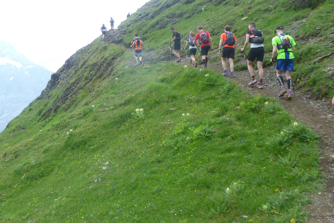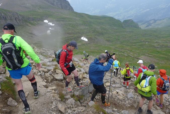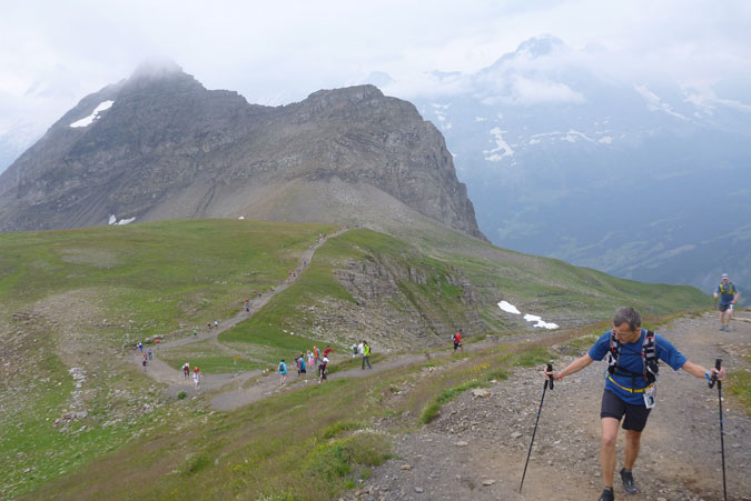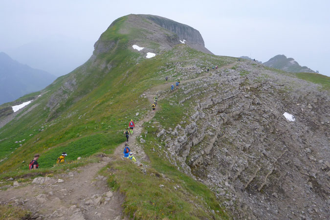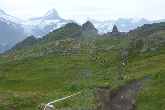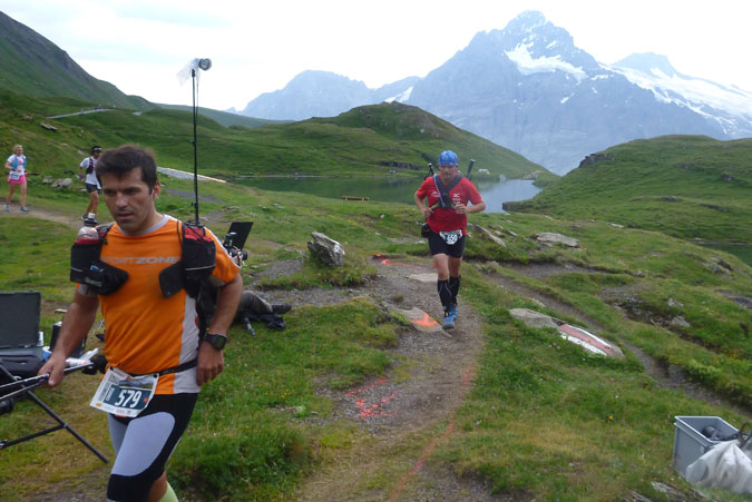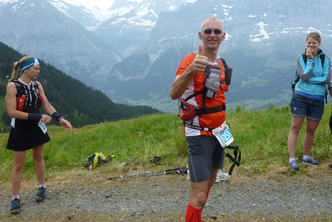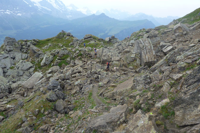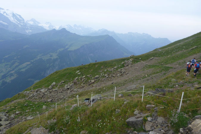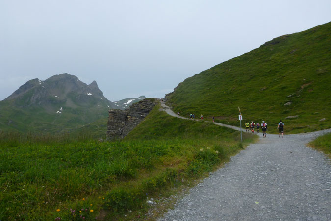 Die rapide Wetterverschlechterung bereitet der Rennleitung große Sorgen. Sollte es noch schlechter werden, steht eine eventuelle Verlegung des Abstieges bis zur Schynigen Platte zur Debatte, sollten wir später erfahren. Am Berghaus Männlichen ist während des kompletten Rennens ein Meteorologe postiert, der die Wetterentwicklung genau beobachtet. Heute Morgen hätte ich im Traum nicht daran gedacht, dass ich heute einmal frösteln muss. Aber es ist wirklich kühl geworden und ungemütlich auf dem Summit. Viele wechseln auf ihre Regenjacken. Ich begnüge mich mit meinen Ärmlingen, in der Hoffnung, dass die ersten Regentropfen nicht noch mehr werden.