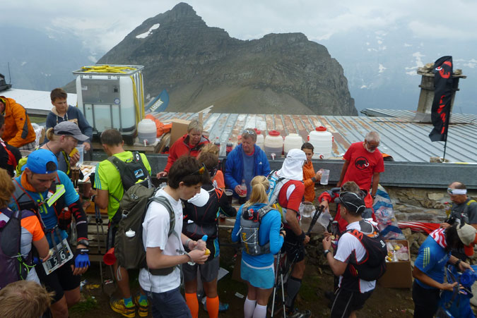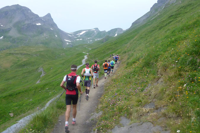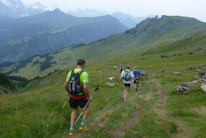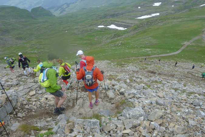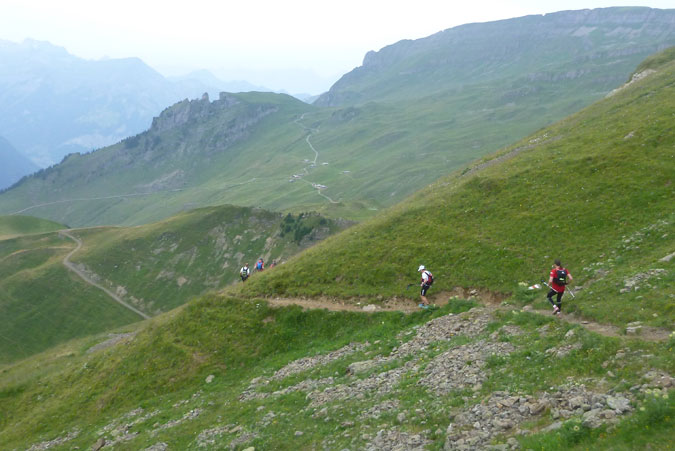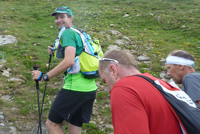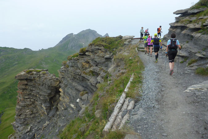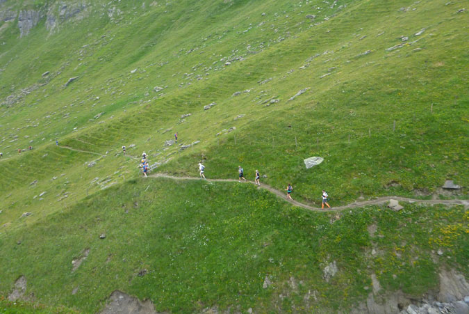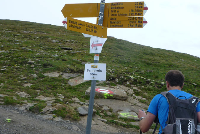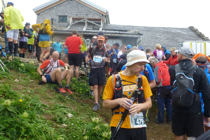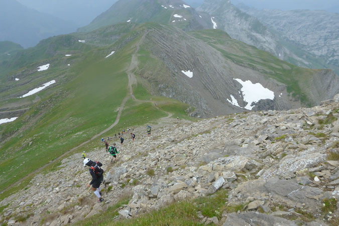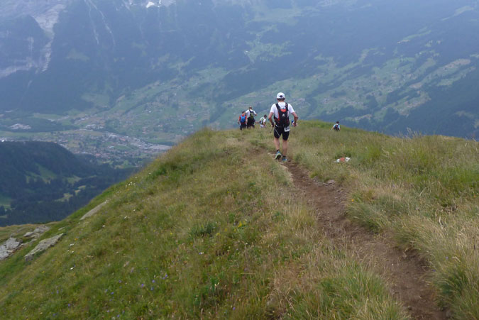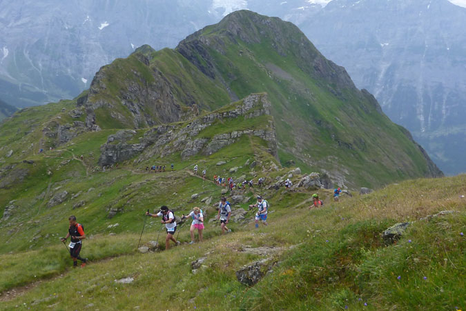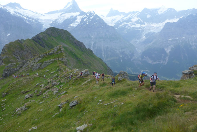 Die rapide Wetterverschlechterung bereitet der Rennleitung große Sorgen. Sollte es noch schlechter werden, steht eine eventuelle Verlegung des Abstieges bis zur Schynigen Platte zur Debatte, sollten wir später erfahren. Am Berghaus Männlichen ist während des kompletten Rennens ein Meteorologe postiert, der die Wetterentwicklung genau beobachtet. Heute Morgen hätte ich im Traum nicht daran gedacht, dass ich heute einmal frösteln muss. Aber es ist wirklich kühl geworden und ungemütlich auf dem Summit. Viele wechseln auf ihre Regenjacken. Ich begnüge mich mit meinen Ärmlingen, in der Hoffnung, dass die ersten Regentropfen nicht noch mehr werden.
