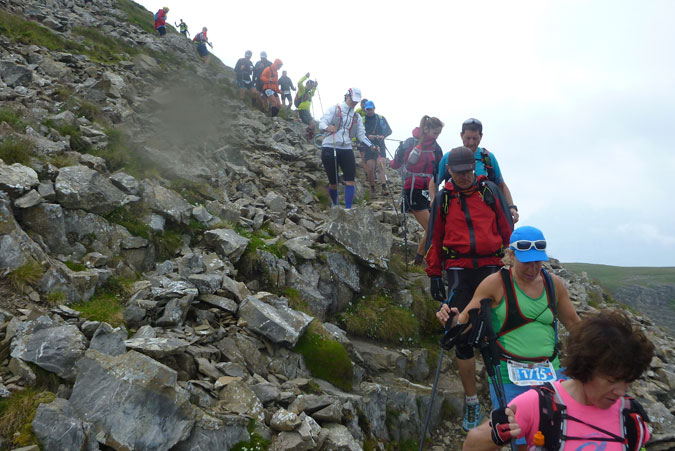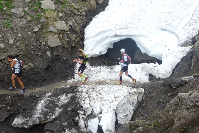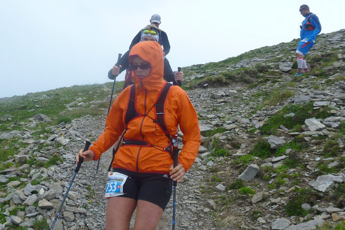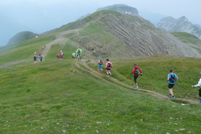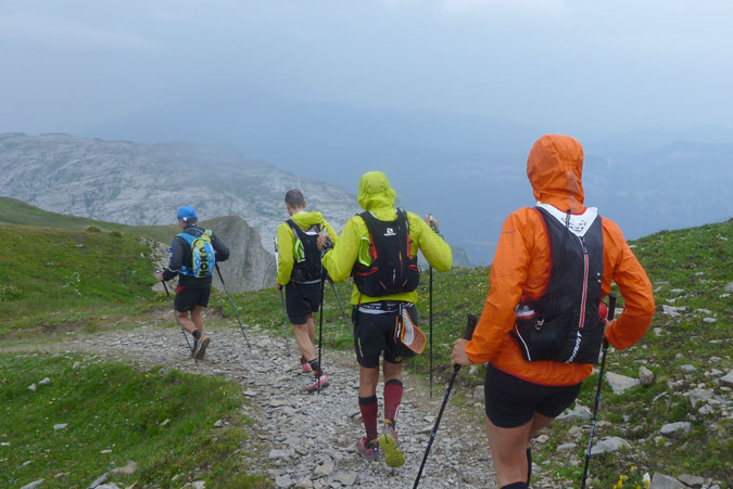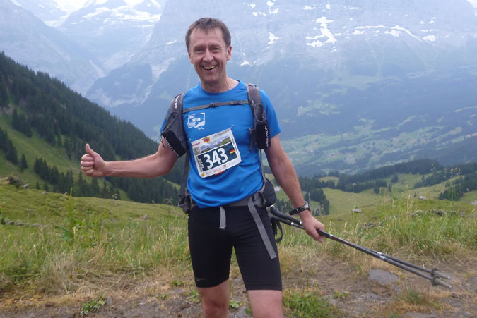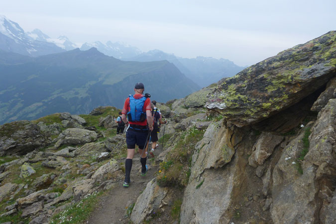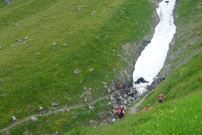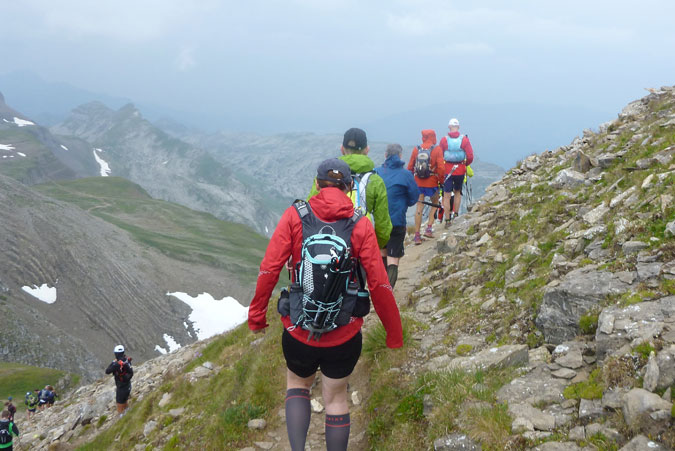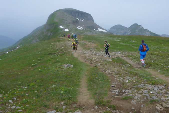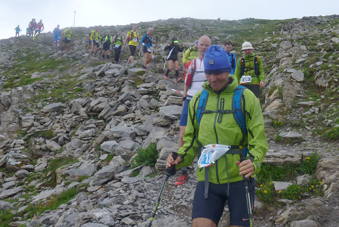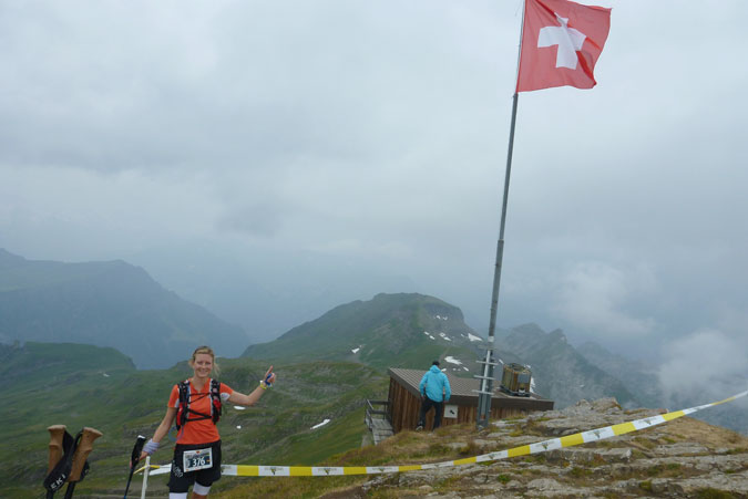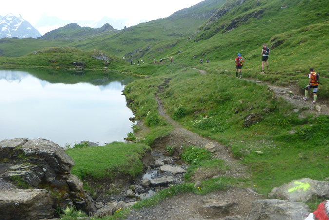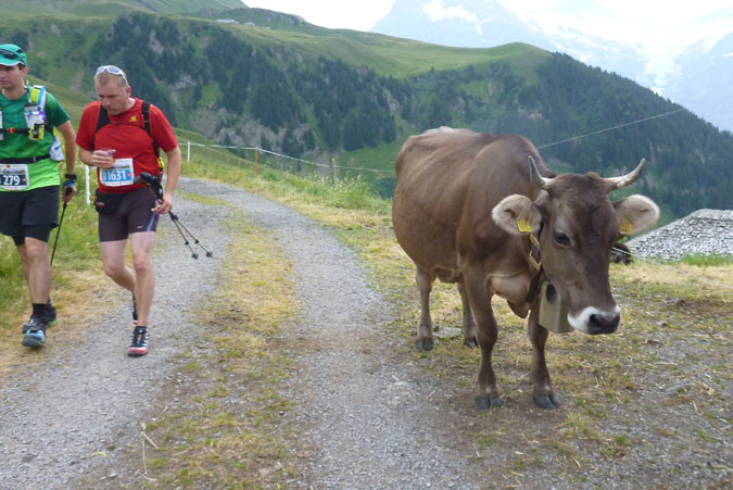 Die rapide Wetterverschlechterung bereitet der Rennleitung große Sorgen. Sollte es noch schlechter werden, steht eine eventuelle Verlegung des Abstieges bis zur Schynigen Platte zur Debatte, sollten wir später erfahren. Am Berghaus Männlichen ist während des kompletten Rennens ein Meteorologe postiert, der die Wetterentwicklung genau beobachtet. Heute Morgen hätte ich im Traum nicht daran gedacht, dass ich heute einmal frösteln muss. Aber es ist wirklich kühl geworden und ungemütlich auf dem Summit. Viele wechseln auf ihre Regenjacken. Ich begnüge mich mit meinen Ärmlingen, in der Hoffnung, dass die ersten Regentropfen nicht noch mehr werden.