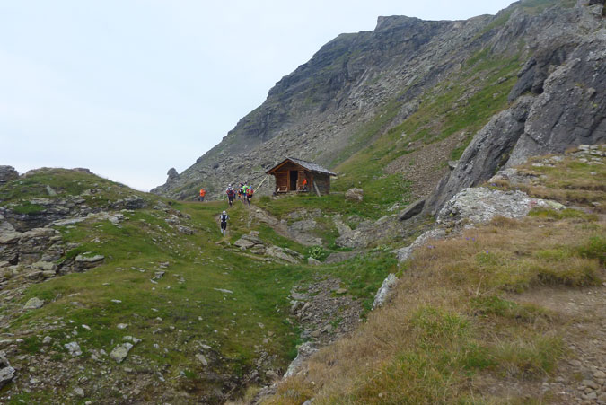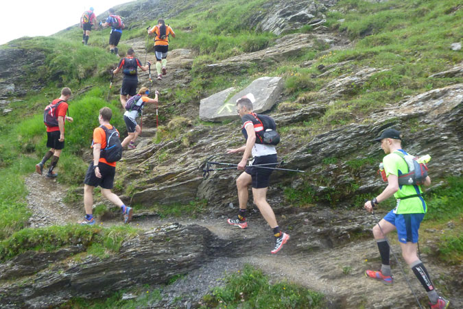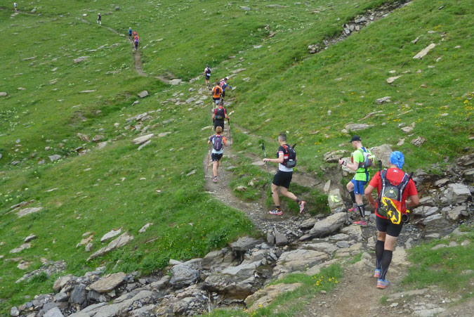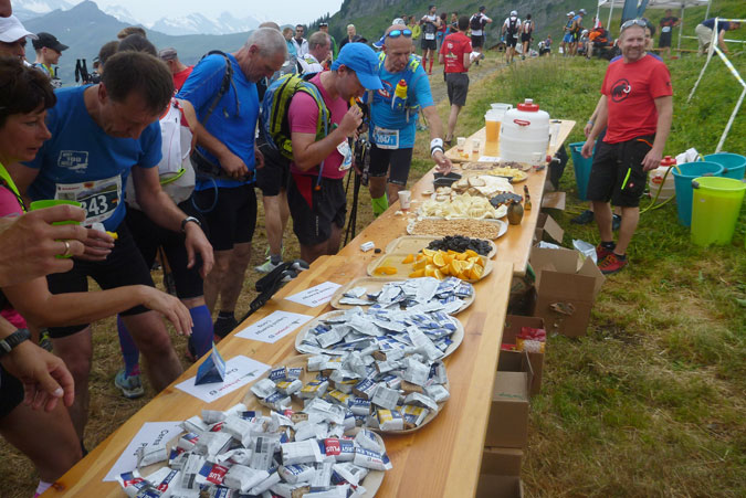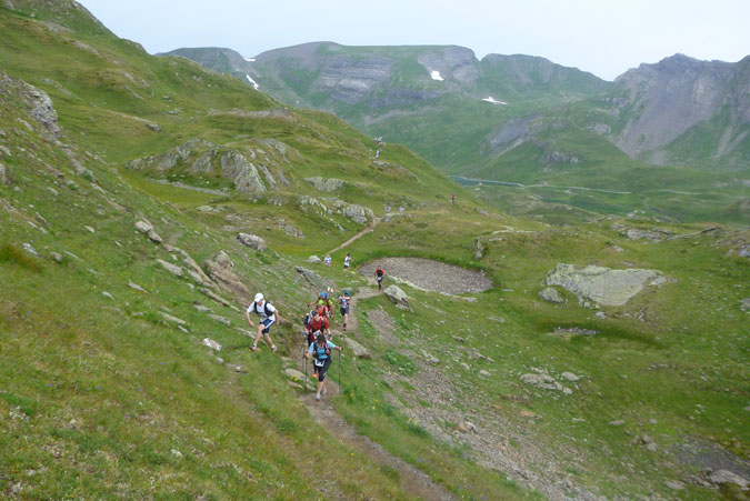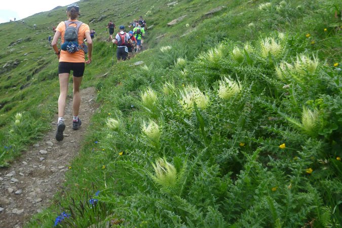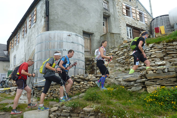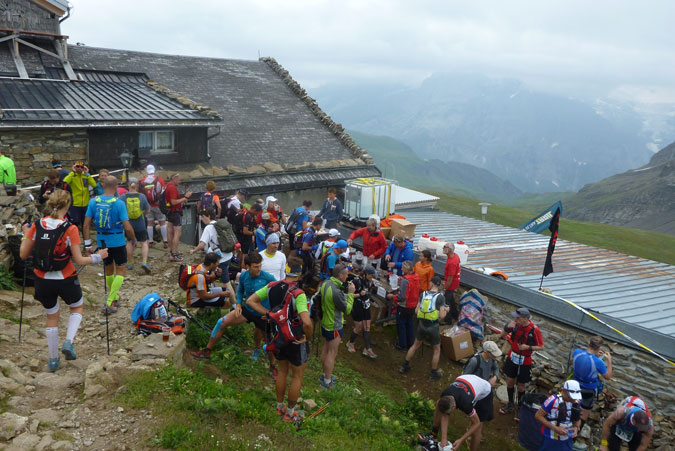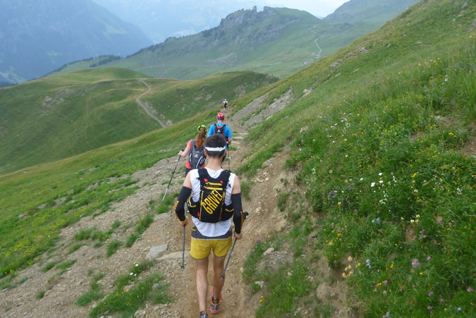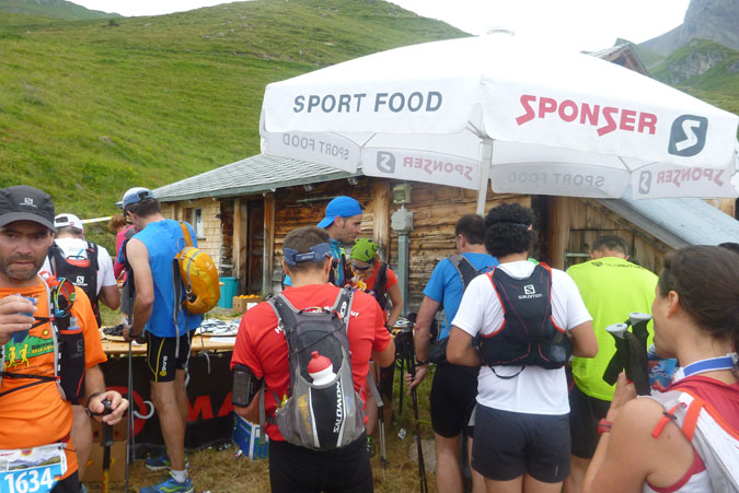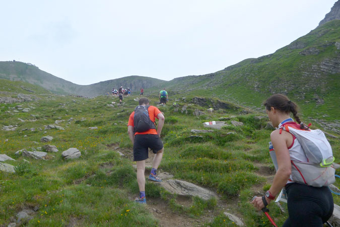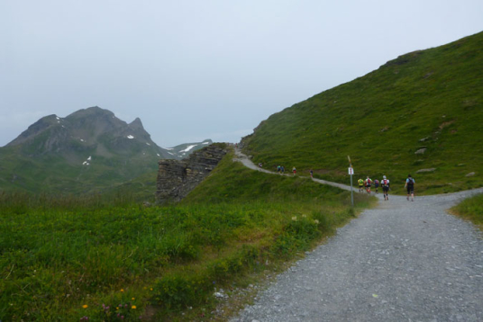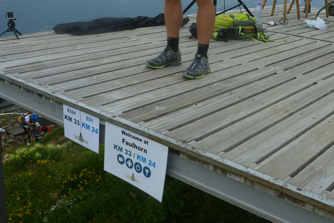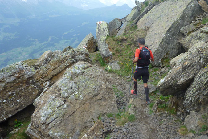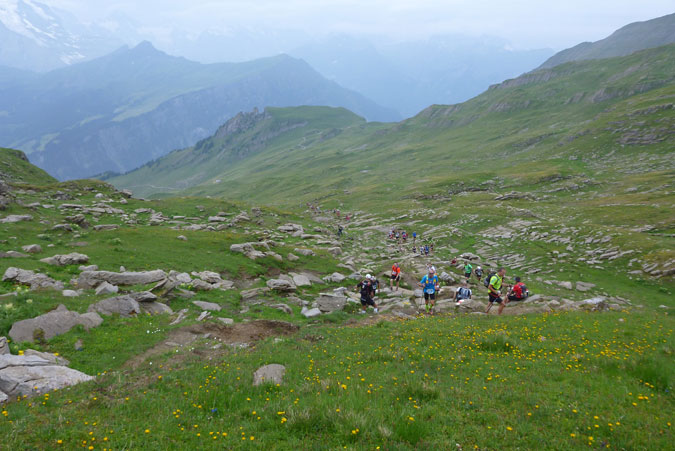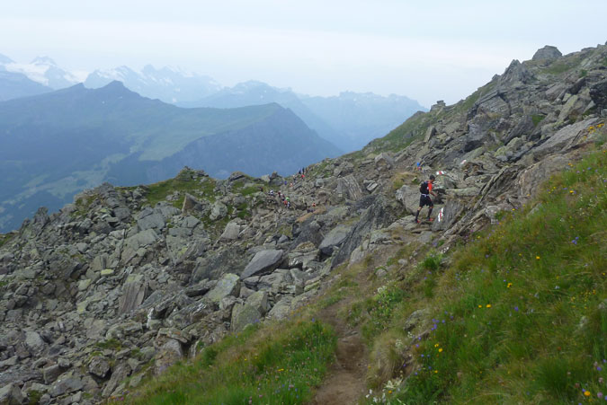 Nach Durchquerung eines Felsenmeers nach einem Übergang geht es durch die weite Alpmulde der Bussalp hinunter und weiter bis Oberläger, dem Standort unserer nächsten Versorgungsstation. Für mich zählen die technisch nicht allzu schweren Trails über Graskuppen und Täler mit der grandiosen Aussicht zu den Highlights der Strecke. 5:15 Stunden beträgt das Zeitlimit an dieser Station. Einen ganz wichtigen Hinweis sollte man nicht ignorieren. Auf den nächsten beiden VPs gibt es wegen ihrer exponierten Lagen keine Möglichkeit, Wasser oder Iso in die eigene Trinkflasche nachzufüllen.