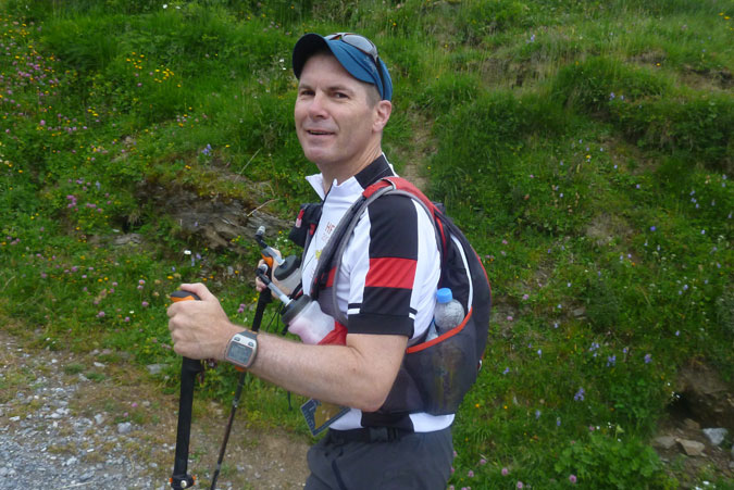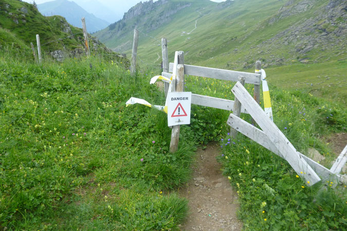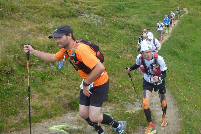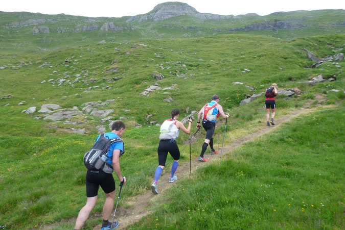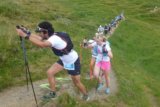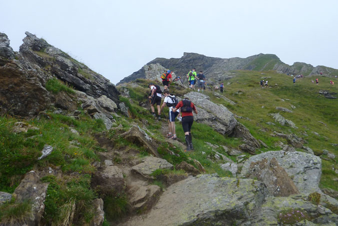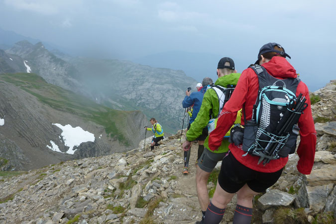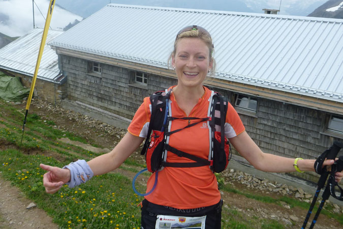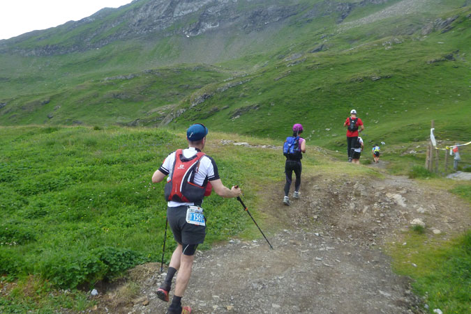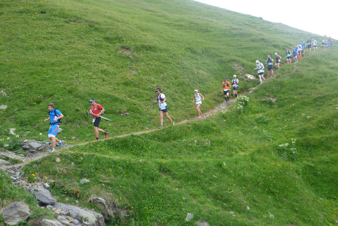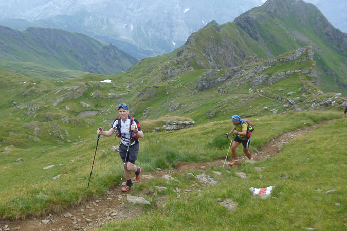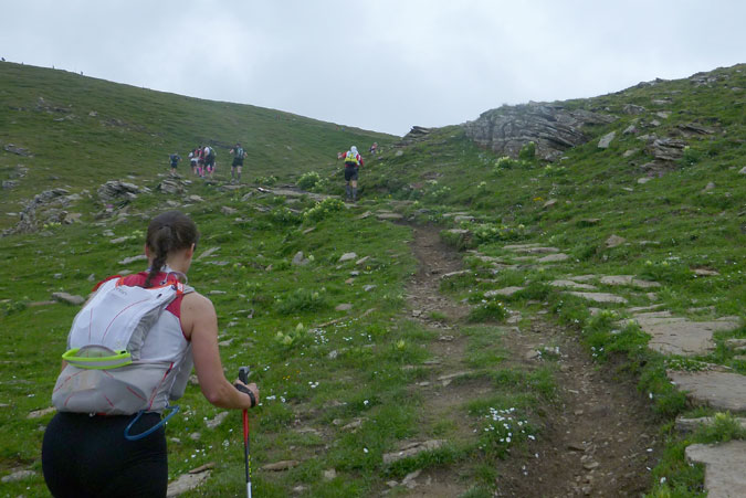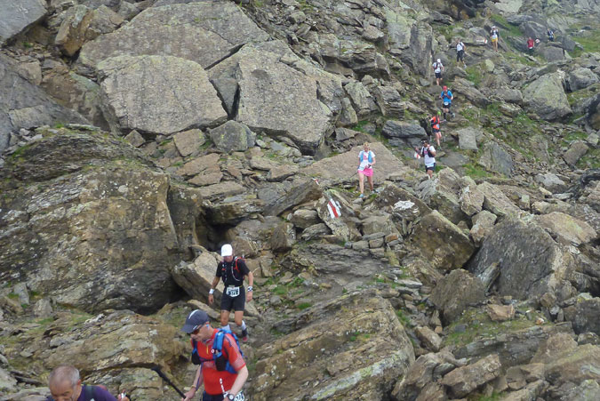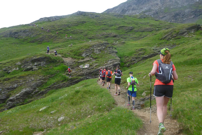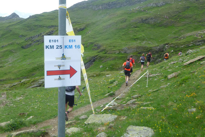 Nach Durchquerung eines Felsenmeers nach einem Übergang geht es durch die weite Alpmulde der Bussalp hinunter und weiter bis Oberläger, dem Standort unserer nächsten Versorgungsstation. Für mich zählen die technisch nicht allzu schweren Trails über Graskuppen und Täler mit der grandiosen Aussicht zu den Highlights der Strecke. 5:15 Stunden beträgt das Zeitlimit an dieser Station. Einen ganz wichtigen Hinweis sollte man nicht ignorieren. Auf den nächsten beiden VPs gibt es wegen ihrer exponierten Lagen keine Möglichkeit, Wasser oder Iso in die eigene Trinkflasche nachzufüllen.