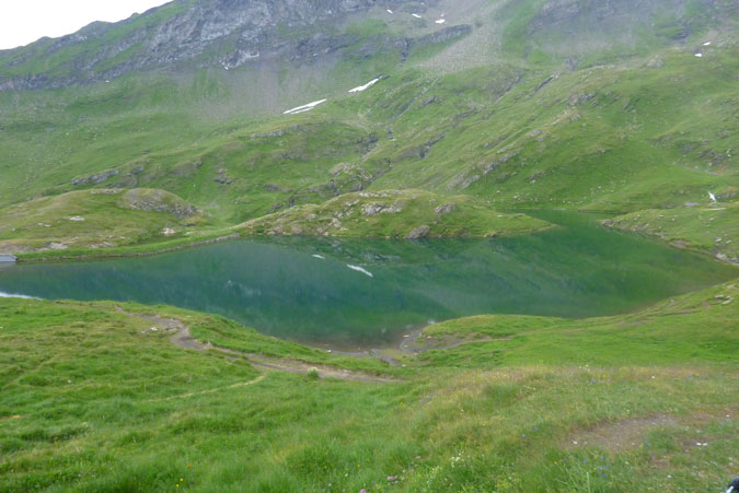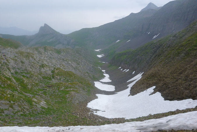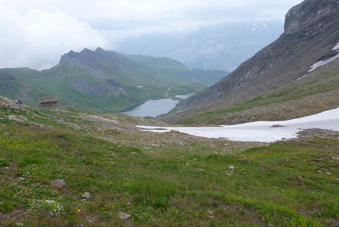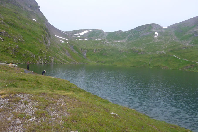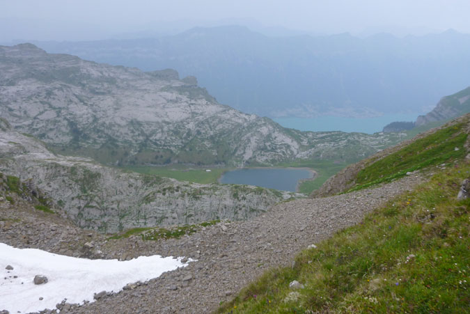 Unter uns liegt jetzt der wunderschöne Sägistalsee auf einer Höhe von 1960 m. Er wird durch zwei Bergbäche gespeist und hat einen unterirdischen Abfluss. Ehrlich, im See gibt es Kanadische Seeforellen. Abschnittsweise kann man über den Bergzug eine Etage tiefer wieder den Brienzersee ausmachen. Immer leicht abschüssig geht es durch das urwüchsige Karstgebiet weiter, kleine Restschneefelder sind dabei noch zu überqueren.
