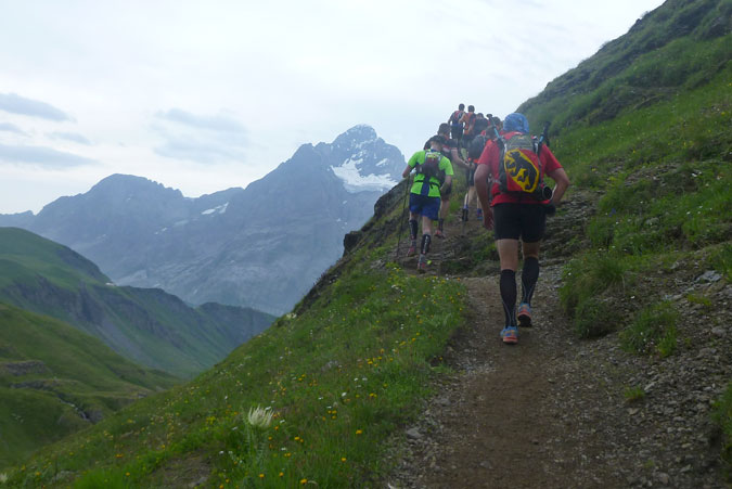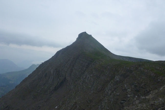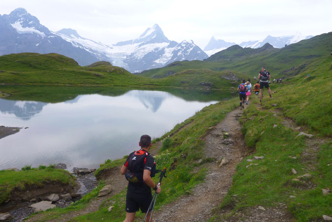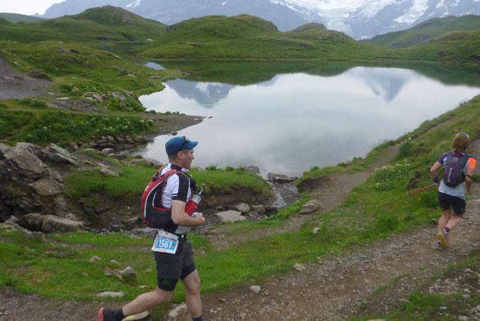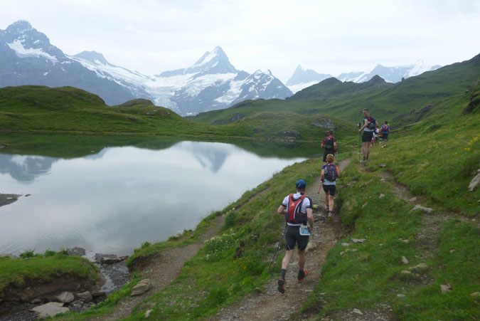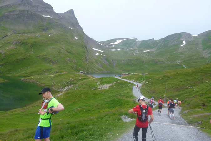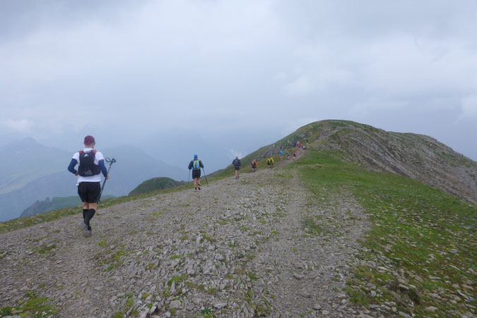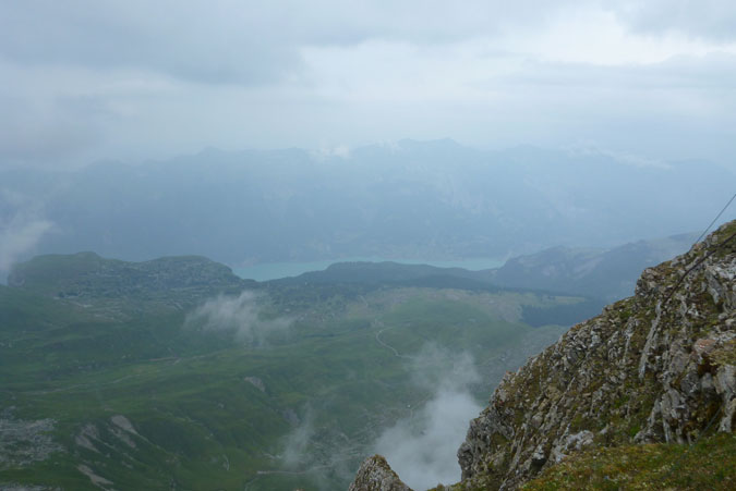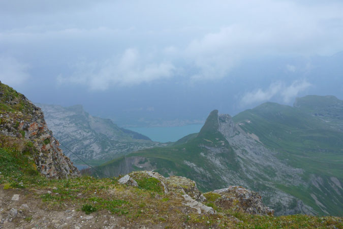 Betrachtet man das Höhenprofil des E51, ist auf dem Gipfel die Hälfte des Rennens gelaufen und ein Großteil der Aufstiege ist bewältigt. Von hier geht es überwiegend nur mehr bergab. 6:30 h ist die benötigte Durchgangszeit um im Rennen zu bleiben. Der Rundblick vom Faulhorn ist trotz des mittlerweile ziemlich dusteren Himmels einfach großartig. Tief unten liegt der türkisblaue Brienzersee, auf der anderen Seite die grauen Silhouetten der 4000er.