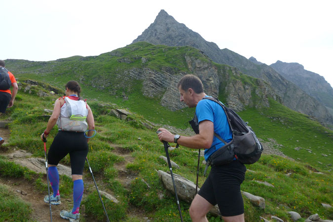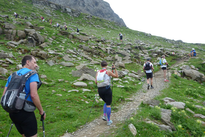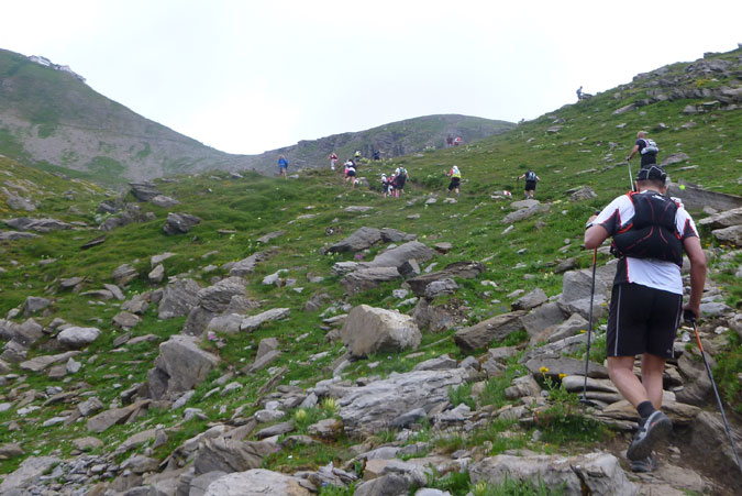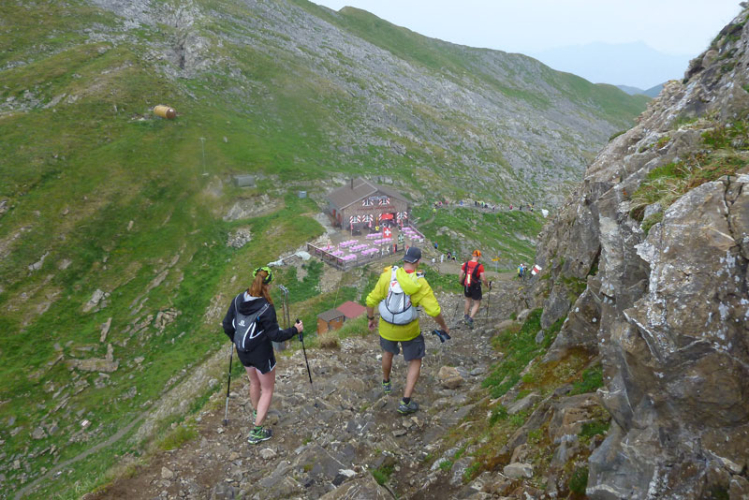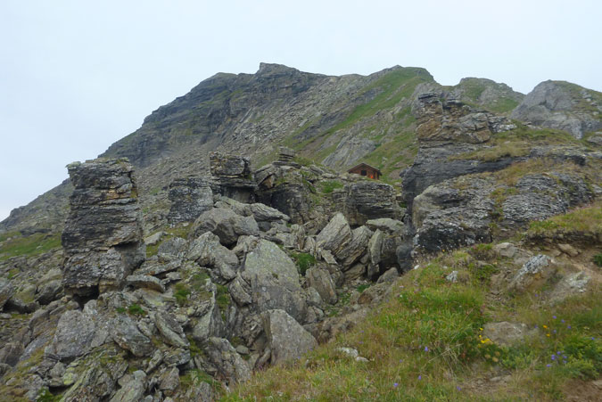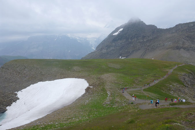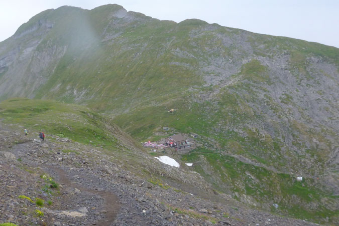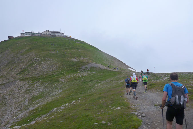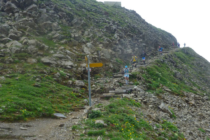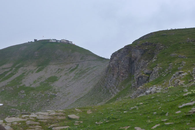 Der Aufstieg über felsdurchsetze Wiesen zum höchsten Punkt der Strecke auf 2680 Meter ist giftig und macht vielen zu schaffen, auf 3,5 km sind über 600 Höhenmeter zu bewältigen. Obwohl es steil hinauf geht, ist er dennoch gut zu begehen, finde ich. Das legendäre Berghotel auf der Spitze liegt dabei immer in Sichtweite. Im Sommer 1832 nahm die Gaststätte ihren Betrieb auf – zum damaligen Zeitpunkt als die höchstgelegene der Alpen.