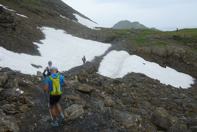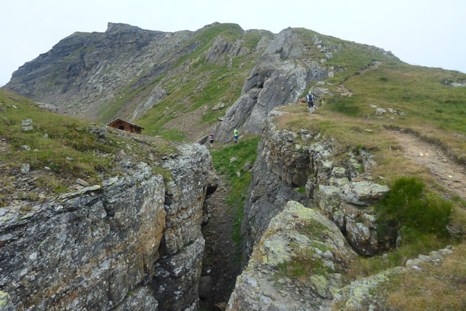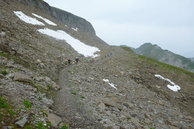 Nach einer Richtungsänderung laufen wir in einer Mulde unterhalb des Sägissa jetzt wieder direkt auf das Faulhorn zu. Ich bin hier nicht der einzige, der durch das grobe Gestein etwas langsamer macht. Dann geht es in einer erneuten 180-Grad-Wendung um den Felsstock des Sägissa herum und an der langgezogenen Nordflanke entlang.