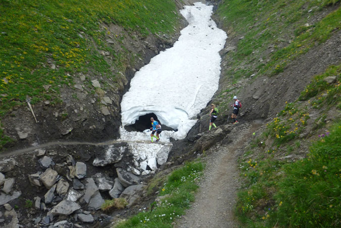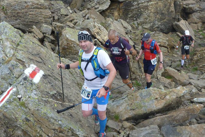 Meine Oberschenkel sind durch den langen Aufstieg gerade ziemlich müde und ich bin schon mehrmals am Stolpern. Irgendwann erwischt es mich dann doch und muss den Staub küssen. Ich habe aber riesiges Glück, mich brettert es genau auf eine größere und glatte Felsplatte und komme ohne Blessur davon. Mein Bergab-Selbstvertrauen ist damit natürlich im Eimer und ich reduziere nochmals mein Tempo, was glücklicherweise zeitlich für mich kein Problem darstellt, da ich doch weit vor dem Zeitlimit liege.