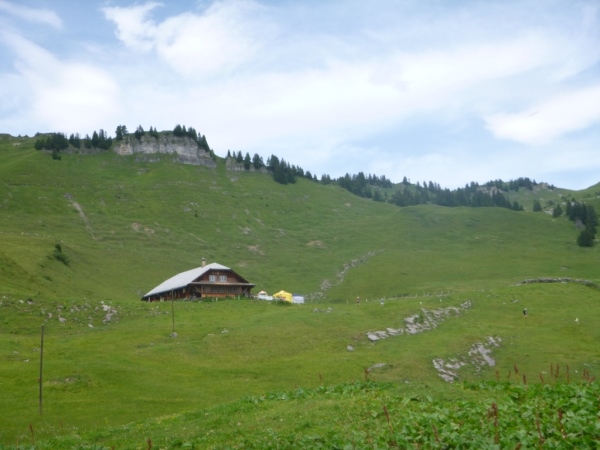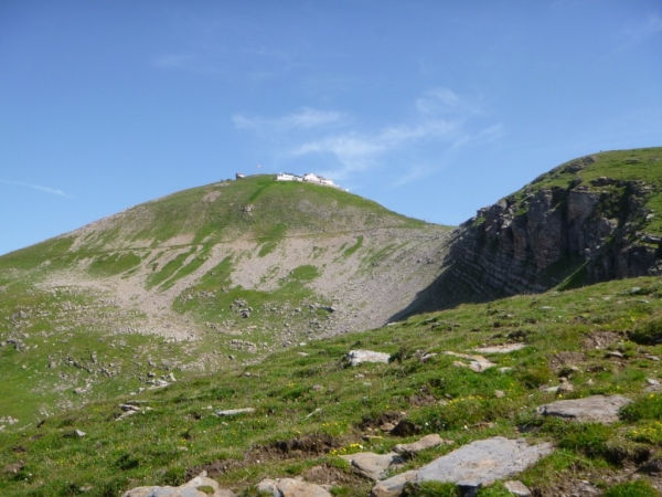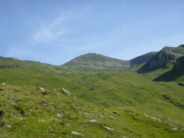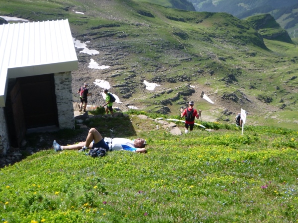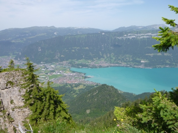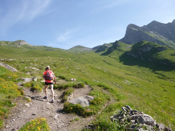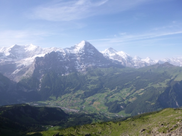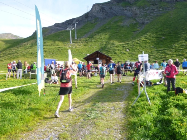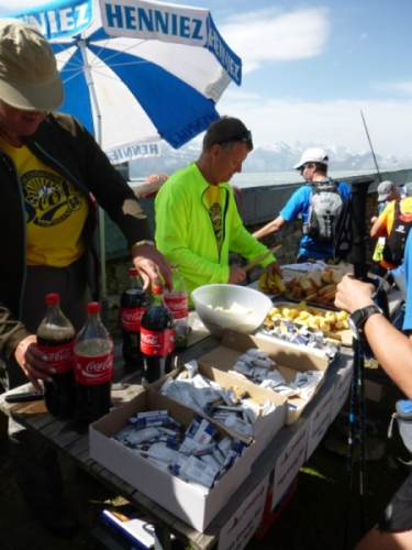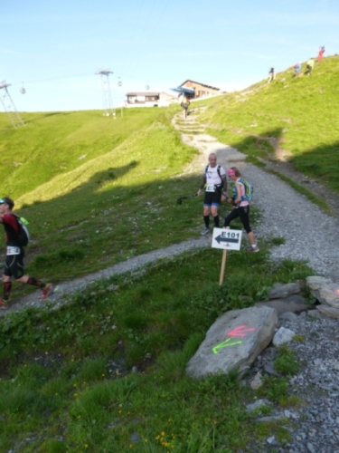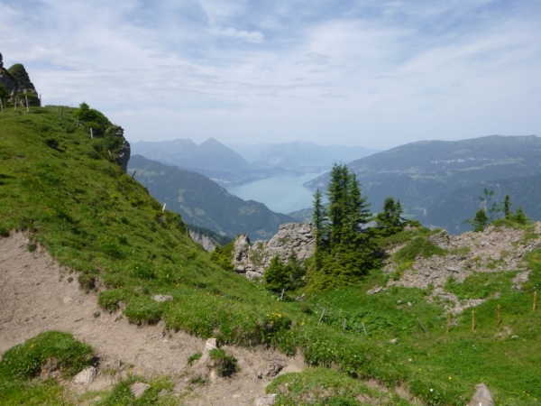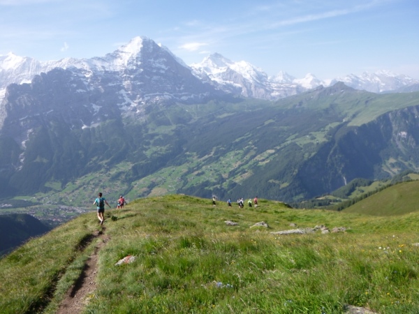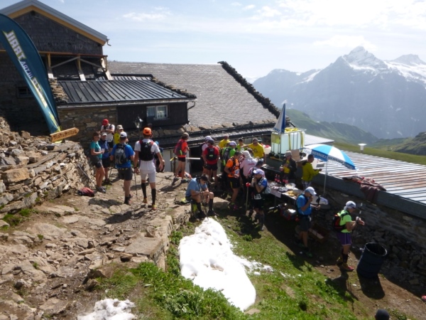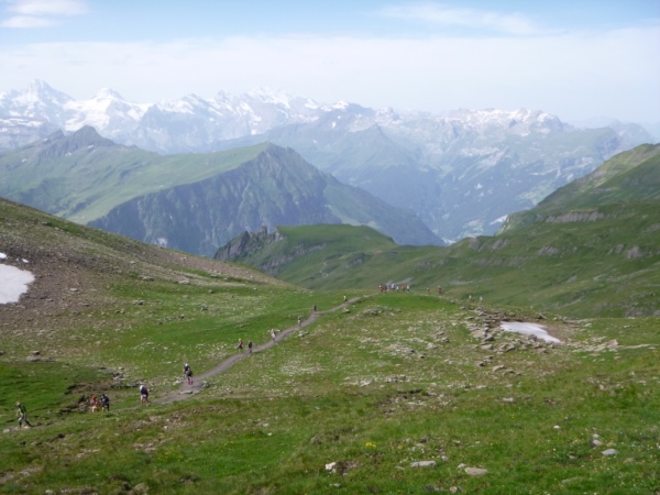 Immer steiler zog sich der Gebirgspfad hinauf, bis wir schließlich das Berghotel auf den Gipfel des Faulhorn (VP/km 33,1/2681 m/Zeitlimit 13:00 Uhr) erreicht hatten. Dort begrüßten uns einige Zuschauer und erneut eine VP, die wir dringend brauchten, denn es war sehr warm geworden und wir mussten uns immer wieder mit viel Flüssigkeit versorgen, um den Wasserhaushalt auszugleichen. Ein Blick zurück zeigte uns noch einmal die Viertausender der Berner Alpen, vor allem der mächtige Eiger mit seiner Nordwand. Vor uns war der Blick frei hinunter auf den stahlblauen Brienzer See und den weiter westlich liegenden Thuner See.