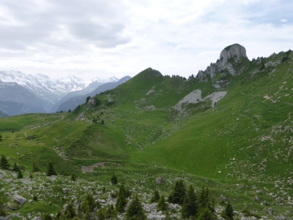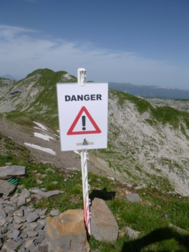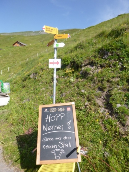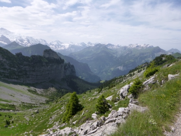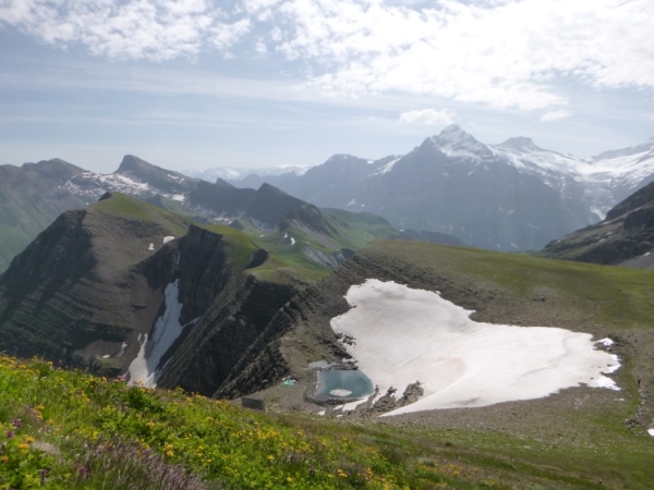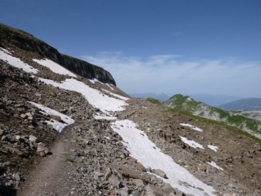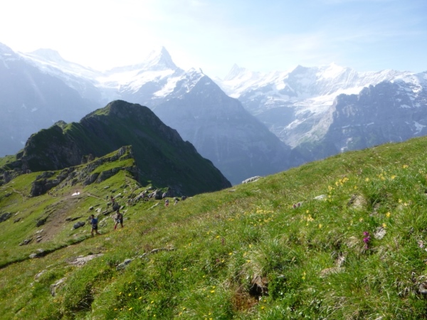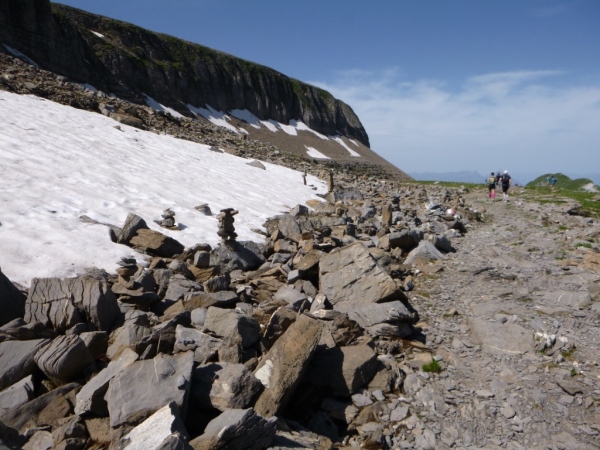 Zur Schynigen Platte gestaltete sich der Weg als überaus abwechslungsreich. Neben gerölligen Abschnitten mussten wir immer wieder Altschneefelder passieren. Die kniffeligen Stellen waren eindeutig mit Hinweisschildern des Veranstalters markiert, damit wir den Hangweg besser meistern konnten. Vorbei am Berghaus Männdlenen (2344 m) ging es weiter durch die graue Steinwüste, bis wir den Panoramaweg an der Schynigen Platte erreichten. Hier oben kamen uns auch viele Wanderer entgegen, die den sonnigen Tag für einen Ausflug nutzten. Manchmal war es nicht so einfach, sich mit den Wanderern zu arrangieren.