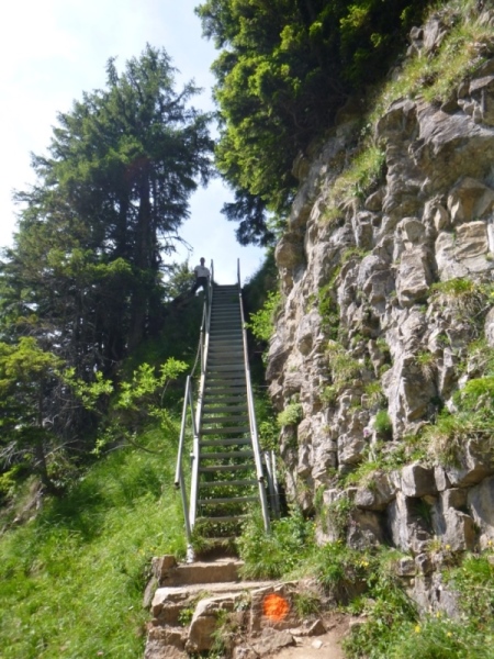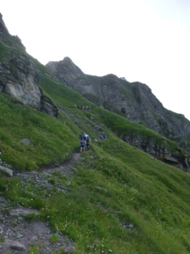 Der Veranstalter wies uns beim Briefing ausdrücklich darauf hin, dass wir nach dem Verlassen der VP die Bahnlinie und die Straße nach Grindelwald überqueren müssten und den Anweisungen der Streckenposten Folge zu leisten hätten. Auf der anderen Talseite sollte nämlich unsere Trailstrecke hinauf nach Wengen weitergehen. Zuerst gingen wir auf einer steilen Asphaltstraße Schritt für Schritt den Berg hinauf. Die Hitze blieb uns erst mal erhalten, was das Hinaufgehen nun doch beschwerlich machte. Allerdings hatte es sich leicht bewölkt, so dass die Sonne nicht mehr ununterbrochen auf uns herunterbrannte.