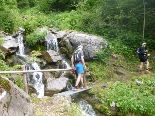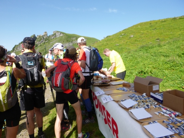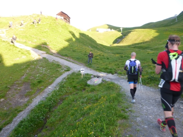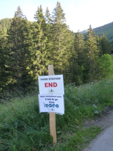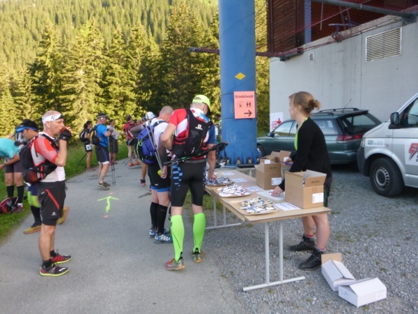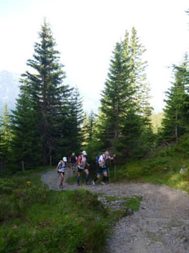 Weiter hinauf auf First 1 (VP/km 13,4) ging es meist über steile Pfade. Die Stirnlampen waren längst im Rucksack verschwunden, stattdessen hatten viele die Sonnenbrille oder eine Schildmütze aufgesetzt. Nach First 1 kommt bekanntlich First 2, doch dazwischen konnten wir schon einmal steile Schotterstraßen genießen und unsere Beine einlaufen, bis wir über Bort (VP/km 17,4/1560 m) wieder mit einem Gegenanstieg gefordert wurden. Wieder oben angekomme,n war dann an First 2 (VP/km 22,7/2163 m/Zeitlimit 10:15 Uhr) erneut ein Verpflegungsposten.