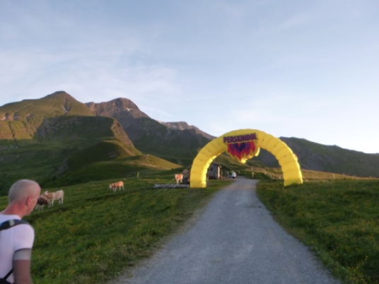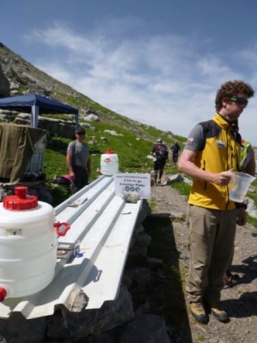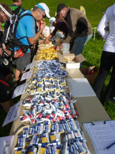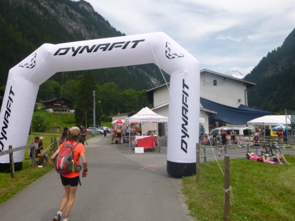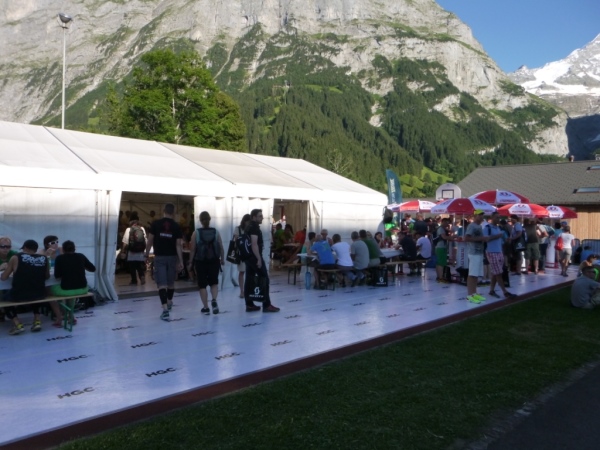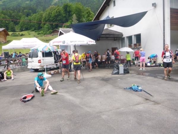 In Burglauenen hatten wir den tiefsten Punkt der E101-Strecke erreicht, auch etwas mehr als die Hälfte der zu laufenden Kilometer und Höhenmeter im Aufstieg. Die bis hier gesammelten knapp 3500 Höhenmeter im Abstieg machten sich nun auch ganz deutlich in den Beinen bemerkbar! Aber nun waren wir erst einmal herunten (km 52,5/905 m/ Zeitlimit 18:00 Uhr). Hier konnten wir uns mit allem Notwendigen versorgen, bevor wir uns auf den zweiten Abschnitt begaben. Wer die verschwitzte Kleidung wechseln wollte, fand hier auch seinen Läufersack und konnte sich in einem Zelt umziehen.