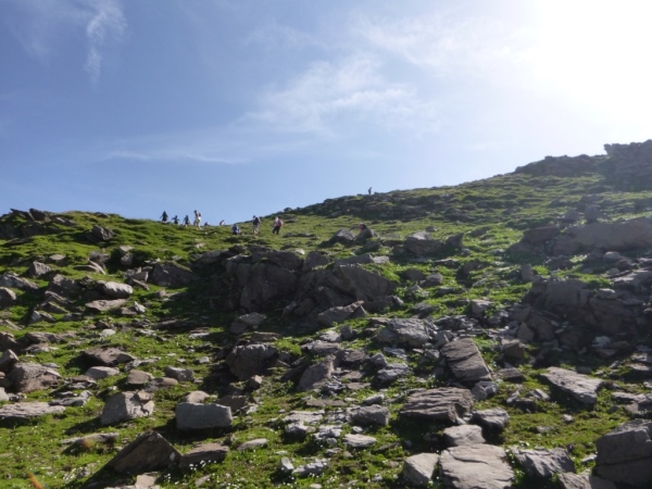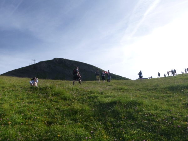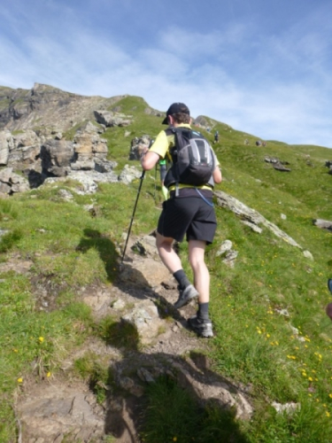 Doch nun erst einmal der Aufstieg auf das Faulhorn und der war gewaltig. Insgesamt drei Kilometer sollte es zuerst über bunt blühende Almwiesen hinaufgehen, bis wir schon von weitem die kahle Kuppel des Faulhorns erkennen konnten. Wie weit war es wohl noch? Schwer einzuschätzen, auf jeden Fall kam das Zwischenziel nur sehr langsam Schritt für Schritt näher. Hier oben sollte es eine Bergwertung geben, aber nicht für mich! Ich wollte in gleichmäßigem Schritt diesen höchsten Punkt der E101-Strecke erwandern und mir noch ein wenig Puste für die kommenden Herausforderungen aufheben.