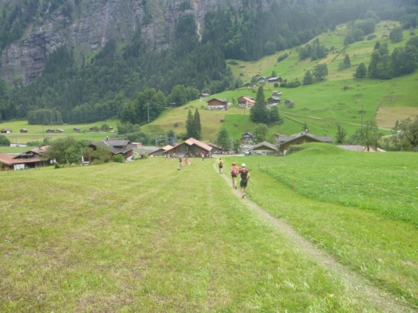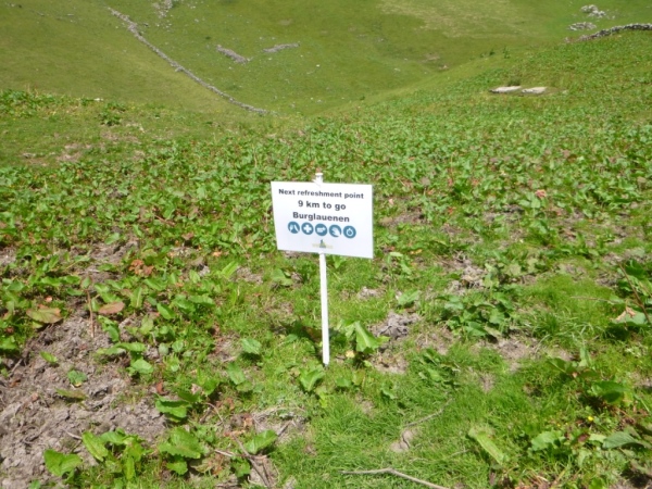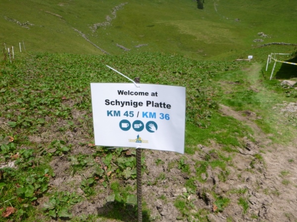 Da der Abschnitt zwischen Faulhorn und Schynige Platte etwa 11 Kilometer auseinander lagen, gab es eine zusätzliche Wasserstelle etwa auf der Hälfte der Strecke. Das war auch gut so, denn der Weg bis zur VP Schynige Platte (km 44,0/1985 m/Zeitlimit 15:30 Uhr) zog sich noch endlos in der prallen Sonne hin. Im Wechsel von Schotter- auf Wiesenwegen ging es steil hinunter nach Burglauenen. Mit einigen giftigen Gegenanstiegen bewegten wir uns am Hang entlang taleinwärts mit ständigen Schritt- und Tempowechsel. Die letzten zwei Kilometer nach Burglauenen waren dann richtig steil, aber hier konnten wir wenigstens laufen.