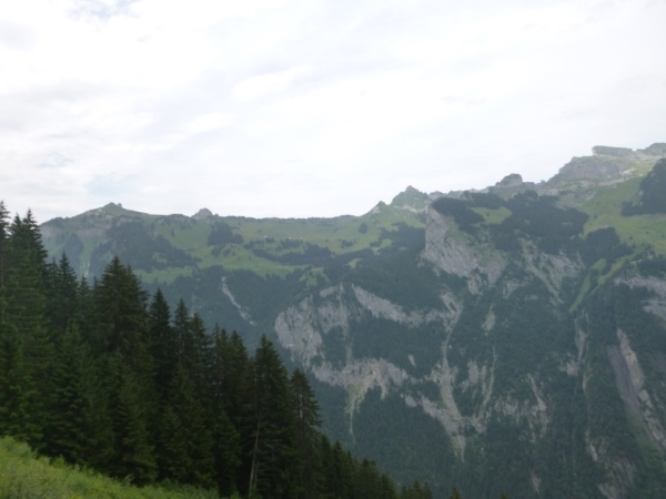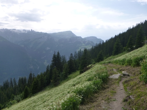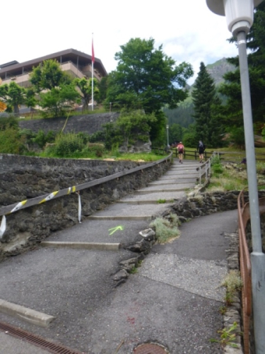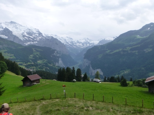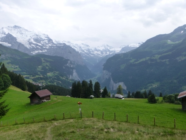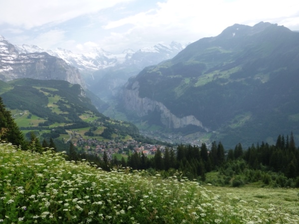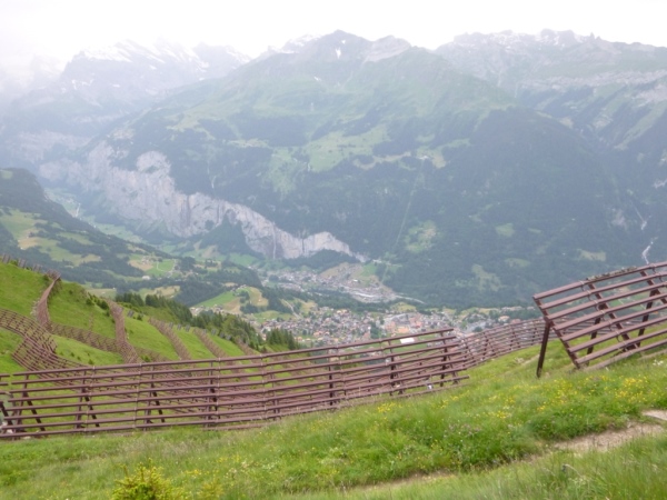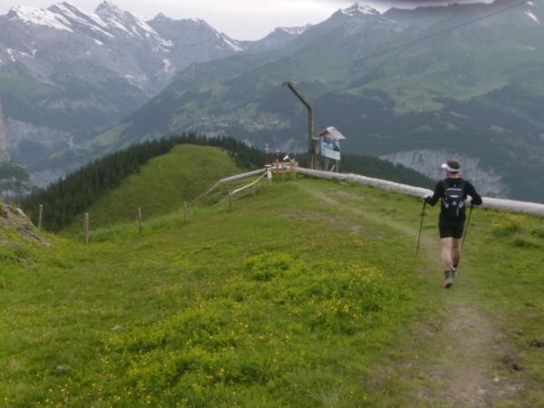 Auf der hinter uns liegenden Talseite konnten wir noch einmal sehen, was wir schon alles geleistet hatten. Der Blick zeigte uns noch einmal das Plateau der Schynigen Platte und die Querung des Steilhangs in Richtung Burglauenen. Nach mehr als einem Kilometer wechselte der breite Weg wieder in einen Trail. An der Spätenalp (1551 m) vorbei ging es nur noch wenig ansteigend nach Wengen, bis wir oberhalb des Ortes an die ersten Häuser herauskamen. Von hier aus konnten wir auch das Lauterbrunnental und die Staubachwasserfälle erblicken, unsere spätere Kulisse beim Aufstieg auf den Männlichen. In Wengen befand sich die VP im Zentrum an der Hauptstraße (km 61,3/1280 m/Zeitlimit 20:30 Uhr).