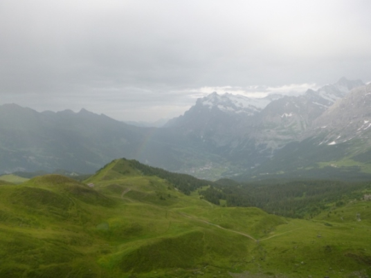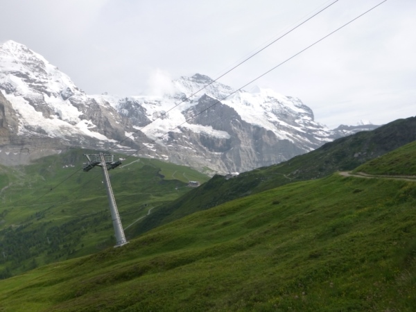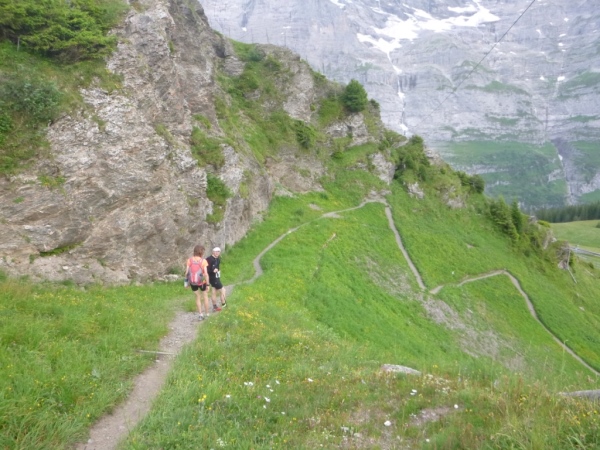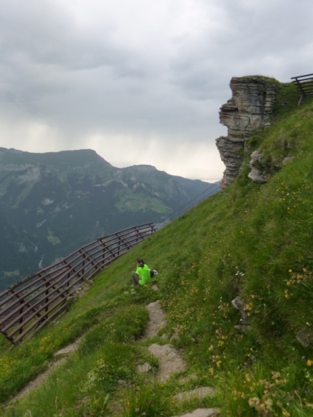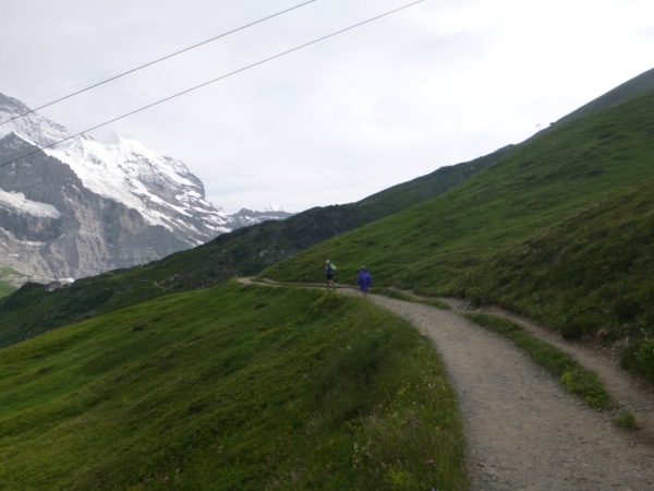 Verdächtig dunkle Wolken zogen auf und wir fragten uns, ob es bald regnen würde. Besorgte Helfer wiesen uns darauf hin, dass sie gleich einen Regenschauer erwarten würden. Der kühle Wind am Berghaus Männlichen ließ uns dann auch unsere Regenjacke anziehen, so wären wir für den bevorstehenden Regen gerüstet! Der Panoramweg Männlichen-Kleine Scheidegg schlängelte sich ziemlich eben am Hang entlang, unterhalb des 2521 m hohen Tschuggen und des 2125 m hohen Honegg. Hier konnten wir einen entspannten Laufschritt wählen, da es kaum Steigungen oder Gefälle gab und der Weg recht breit und gut ausgebaut ist.