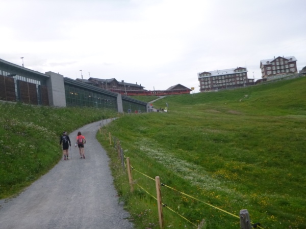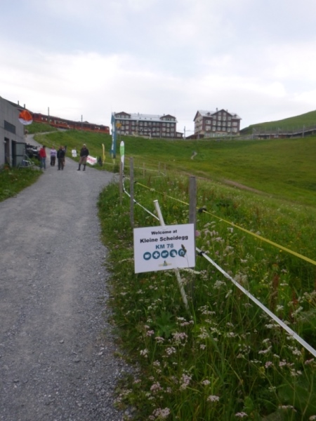 Also hinauf aufs Lauberhorn, bis zum Starthäuschen der berühmten Lauberhornabfahrt, über deren grüne Wiesen – aber nicht im Schuss! – wir dann auch hinunterrannten. An der Bahnstation Wengernalp hatten wir den tiefsten Punkt zwischen Männlichen und Kleine Scheidegg erreicht. Nun ging es auf einem steilen Fahrweg an der Bahntrasse entlang hinauf zur Passhöhe Kleinen Scheidegg (VP/km 77,8/2061 m), wo die VP im windgeschützten Lokschuppen der Wengernalpbahn untergebracht war.