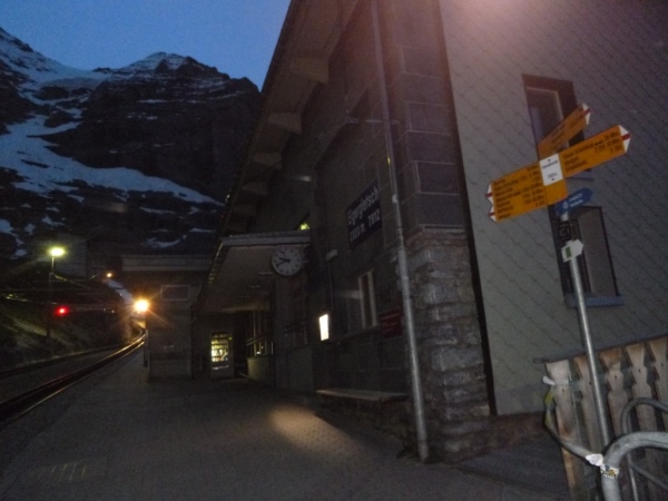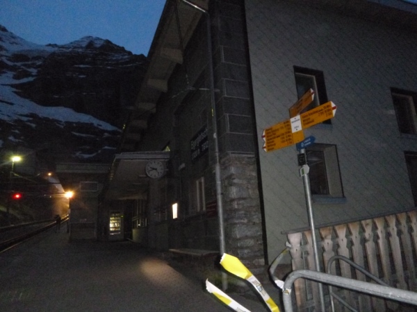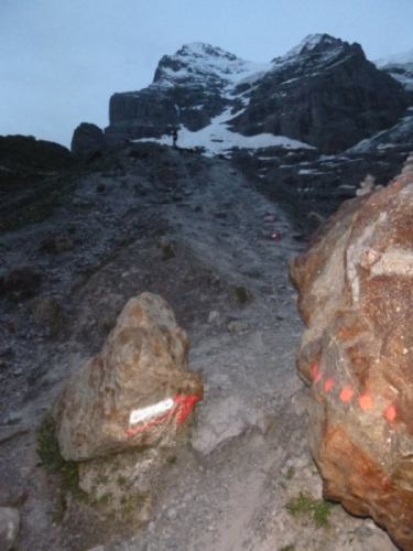 Die Station der Jungfraujochbahn „Eigergletscher“ (2320 m) war auf diesem Steckenabschnitt dann der höchste Punkt. Der Kontrollposten kurz hinter der Bahnstation notierte im Vorbeigehen unsere Startnummern. Und nun ging es auf den Eigertrail, der sich über 6 Kilometer unterhalb der Eigernordwand entlang schlängelt. In der Nacht erschien uns die Nordwand noch viel mächtiger als am Tag, schwarze und teils überhängende Felsen waren über unseren Köpfen. Immer wieder ging es über Schneefelder und durch rauschende Gebirgsbäche. Zuerst versuchten wir noch im Trockenen durch das kalte, rauschende Nass der Bäche zu kommen, doch irgendwann war es unmöglich, das tiefe Wasser trockenen Fußes zu queren. Glücklicherweise hatte es in der Nacht nicht sehr abgekühlt und das kalte Gebirgswasser war so eher eine erfrischende Abkühlung für die Füße.