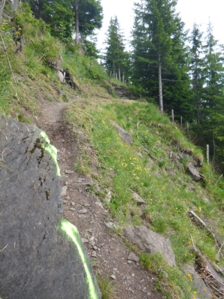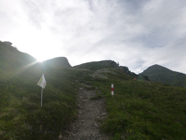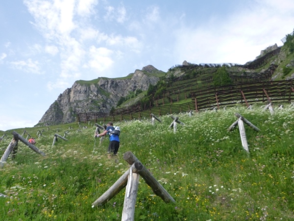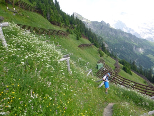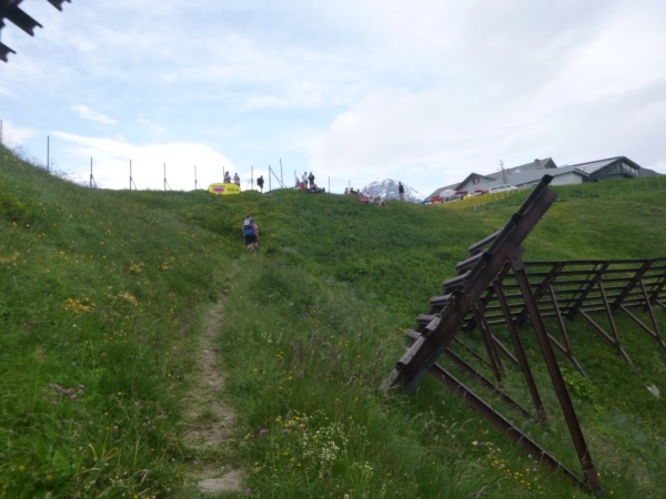 Der Aufstieg auf den Männlichen war mit „Gemsenweg“ beschildert. Ich fühlte mich aber nicht mehr wie eine Gams, die hier leichtfüßig den steilen Pfad hinauf springt. Vielleicht wurde dieser steile Pfad auch nur deshalb so genannt, weil es im oberen Teil des Männlichen Gemsen zu bewundern gibt?! Uns begleiteten wunderschöne Blumenwiesen entlang des steilen Pfades. Oberhalb der Baumgrenze trafen wir dann auf die Lawinenverbauungen unterhalb des Männlichengipfel (2342 m), die im Sommer den Steilhang gegen Steinschläge und im Winter gegen Lawinen schützen. Kurz unterhalb des Gipfels querten wir den Hang, um direkt zum Berghaus Männlichen (VP10/km 67,8/2224 m/Zeitlimit 23:00 Uhr) hinüberzugehen. Beim vorabendlichen Briefing wurde die Streckenänderung mit der großen Steinschlaggefahr begründet. Dadurch war die Strecke insgesamt 400 Meter kürzer und hatte 80 Höhenmeter weniger als auf dem Plan!