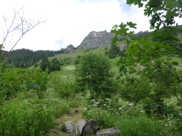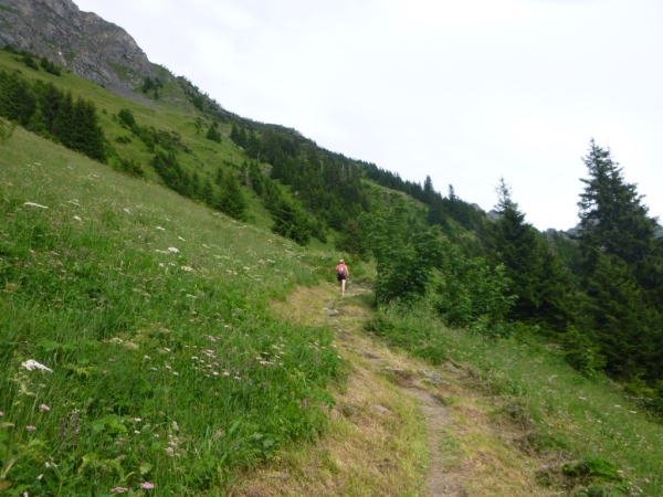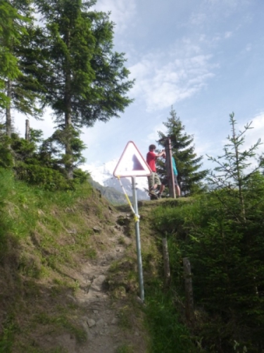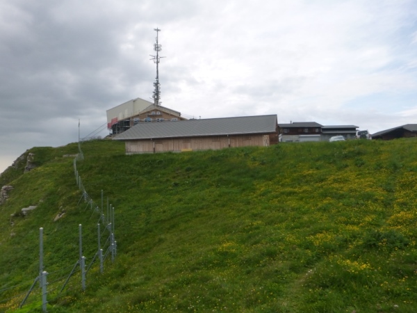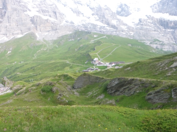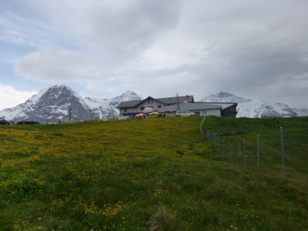 Die dunklen Regenwolken hatten sich verzogen, wir hatten nur drei Tropfen abbekommen. Unter der Regenjacke wurde es dann auch gleich zu warm, also weg damit. Bis Rotstöckli sollte es so weiter gehen. Schon von weitem konnten wir die Hotels und das Bahnhofsgebäude auf der Kleinen Scheidegg sehen. Und eigentlich wären es nur noch 10 Minuten bis hinunter zur Scheidegg gewesen, aber wir sind ja hier, um möglichst viele Höhenmeter und auch Kilometer zu sammeln.