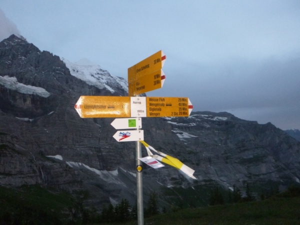 Noch wenige Meter fehlten bis zur Passhöhe, bevor es dann wieder bis Haareg hinunter auf die Strecke des Jungfrau Marathons ging. Hier oben blies ein fürchterlich starker Wind und er sollte uns auf der Eigermoräne fast wegblasen. So waren wir hier mehr damit beschäftigt, gegen den Wind anzukämpfen als vorwärts zu kommen. Unsere Windjacken hatten wir wieder übergestreift, Mütze und Stirnlampe hatten wir auch schon aufgesetzt, denn so ganz allmählich wurde es dunkel. Nur langsam erreichten wir das obere Ende der Eigermoräne, begleitet von tosenden Windgeräuschen. Die Strecke des Jungfrau Marathon zweigte schon viel früher zurück zur Kleinen Scheidegg ab.