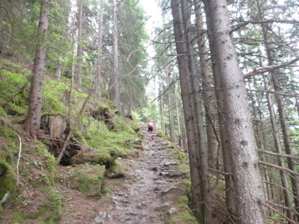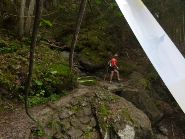 Wo waren wir nur? Keine Sicht im dunklen Wald, einzig der Lichtkegel unserer Stirnlampe erleuchtete den Pfad. Wann kam endlich der Aufstieg zum Pfingstegg? Nur das laute Rauschen des Gebirgsbachs konnten unsere Ohren wahrnehmen, bis wir auf einem Schild lasen, dass hier die Gletscherschlucht ist. Vorbei am Marmorbruch, wo es noch eine zusätzliche Getränkestelle gab, kam dann endlich der 2 km lange steile Aufstieg auf das Pfingstegg (VP/km 94,8/1392 m).