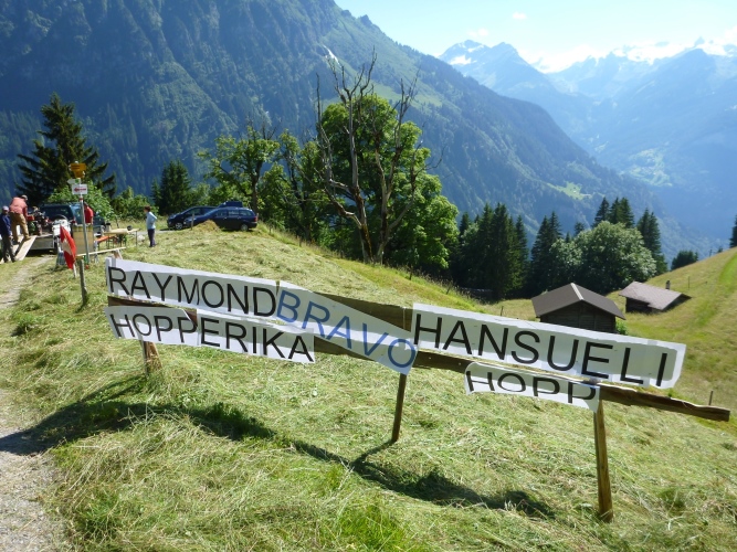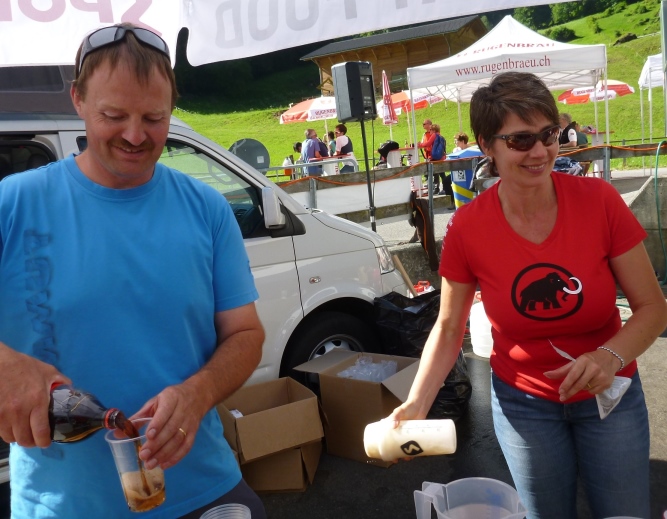 „Ja, die Kühe haben wir auf die Alp gelassen“, lacht ein Helfer, „damit wir euch hier versorgen können.“ Es riecht ein wenig streng nach Rindvieh im Kuhstall, wir müssen zumindest nicht aus dem „Boarn“ saufen. Ich tanke wieder bis zur Oberkante und sehe dann, dass am Ausgang die Spezialitäten kredenzt werden: Rindfleisch und Bergkäs, da brauch ich nicht mal Brot dazu.