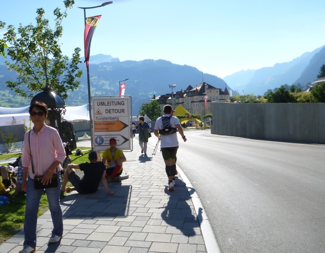 Auf der Dorfstraße laufen wir bereits leicht ansteigend an der Dorfkirche und am Heimatmuseum vorbei. Nur wenige Leute stehen jetzt an der Strecke, meist Angehörige der Läufer, Beschäftigte in den Hotels und Einwohner. An einer Stelle sehe ich den Unteren Grindelwaldgletscher. Der Ischweg bringt uns aus dem Ortsgebiet, der Untergrund ist noch asphaltiert. Die ersten paar Kilometer sind sogar noch einzeln ausgeschildert.