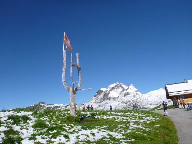 Der First auf 2167 Meter Seehöhe ist über eine Gondelbahn von Grindelwald erreichbar. Wintersport und Wandern ist daher leicht möglich. Und für den Besucher und für uns steht ab heuer eine Attraktion bereit. Unsere Strecke führt über den „First Cliff Walk by Tissot“: Ein Rundweg um den First mittels Felssteg und Hängebrücke. Ein mulmiges Gefühl macht sich bei mir breit, aber dann kommen Läufer von hinten und ich gehe auf den luftigen Steg. Ein paar Mal muss ich meine Birne einziehen, nicht dass ich mir dieselbe am Gestein anhaue. Der Fels ist härter als mein Sturschädel. Die Kamera leistet Hochbetrieb, gerade an der Hängebrücke, wo es gehörig in die Tiefe geht. Mit einem Rundbogen gelangen wir schließlich auf die Sonnenterrasse des Berggasthofes, wo wir wieder verpflegen können. Im Spätsommer 2015 wurde der Steg eröffnet. Schade, dass das prickelnde Erlebnis nur drei, vier Minuten dauert.