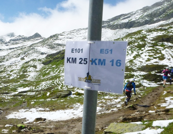Ganz was Neues, unbekannt, keine Ahnung, was da zu tun ist. Aber Bernie gab mir tags vorher schon den Rat, den Rucksack ja vollständig zu packen. Was da im Rennen auf dem E51, das wird meine Distanz, mitzuführen ist, wird penibel kontrolliert: Rucksack, Handy, Rettungsdecke, Pfeife, elastische Binde, Goretex-Jacke, langes Shirt und Hose, Stirnband oder Mütze, Handschuhe, Sonnenbrille, Trinkbecher, Wasserflasche und Verpflegung. Wer Stöcke mitnehmen will, muss diese bis zum Ende dabeihaben. Die Helferin schaut sogar in meine kleine Erste-Hilfe-Tasche rein und meint zu den Spikes, die ich ebenfalls mitführen will: „Ich weiß nicht, ob die zweckmäßig sind, gehe auf das Teilnehmerbriefing und höre dich um:“