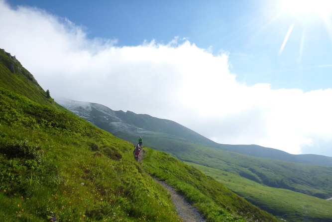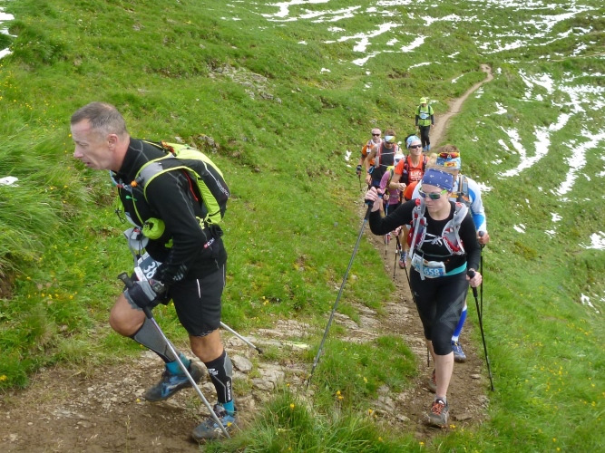 Dann gibt es auf dem weiteren Weg einen Stau, überholen ist nur erschwert möglich. Die Ursache ist eine Frau, vielleicht 25 Jahre alt, sie traut sich nicht weiterzugehen. Sie hat eine Blockade, trotz Stecken. Einer der Helfer spricht immer von einem „Lutscherei“, von einem weiteren Schritt. Ich gehe vorbei und reiche ihr die Hand für ein wenig Sicherheit. Der andere hält sie am Rucksack fest. Zurück geht nicht, da Läufer entgegenkommen. Es dauert Minuten, bis das Gelände weniger abschüssig wird, die Frau kann wieder alleine weiterlaufen. Tags darauf bedankt sich der Vater des Mädchens bei mir für das tatkräftige Zupacken. Andere Läufer hätten bestimmt auch geholfen. Vorbildlich sind auch diejenigen, die nur langsam weiterkamen. Keiner hat gemurrt.