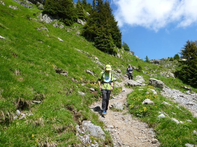 Nur leicht aufwärts geht es zu einer Hochalm, wo sich ein paar Leute versammelt haben. Dort wird die Wegbeschaffenheit wieder alpin-rustikal und ansteigend.
