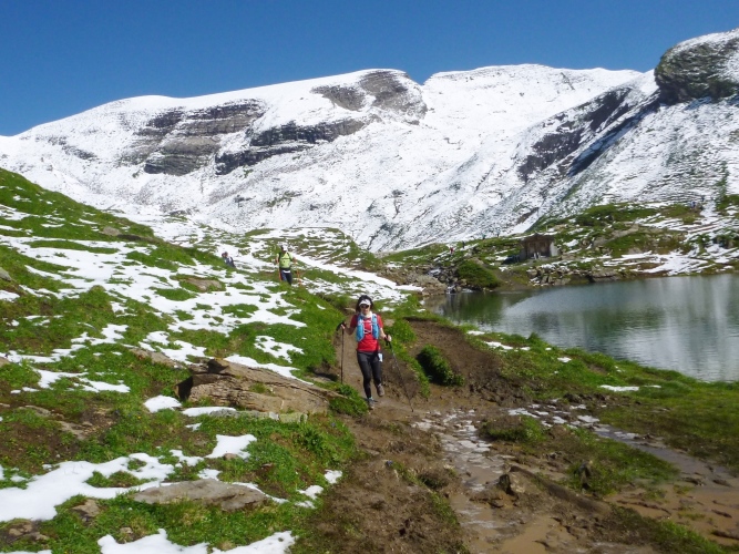 Ein breiter, bequemer Wanderweg führt uns dann über die Gummihütte zum Bachalpsee. Der drei Kilometer lange Wanderweg ist sehr beliebt bei den Wanderern: Blühende Almwiesen und der Blick auf die scharfen Spitzen von Schreckhorn, Wetterhorn und Finsteraarhorn.